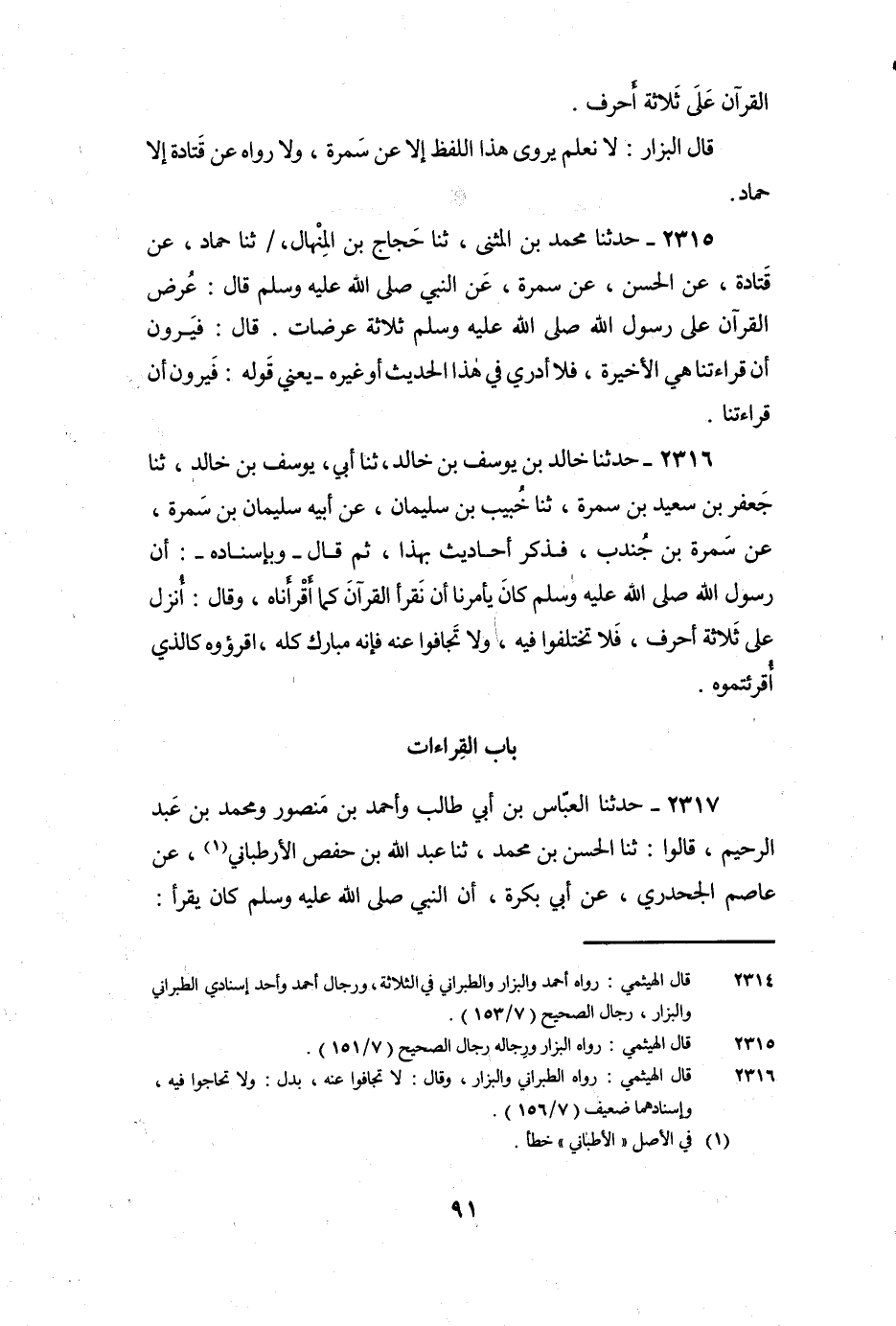 2315 - حَدَّثَنَا مُحَمَّدُ بْنُ الْمُثَنَّى، ثنا الْحَجَّاجُ بْنُ الْمِنْهَالِ، ثنا حَمَّادٌ، عَنْ قَتَادَةَ، عَنِ الْحَسَنِ، عَنْ سَمُرَةَ، عَنِ النَّبِيِّ صَلَّى اللَّهُ عَلَيْهِ وَسَلَّمَ قَالَ: «عُرِضَ الْقُرْآنُ عَلَى رَسُولِ اللَّهِ صَلَّى اللَّهُ عَلَيْهِ وَسَلَّمَ ثَلاثَ عَرَضَاتٍ» .