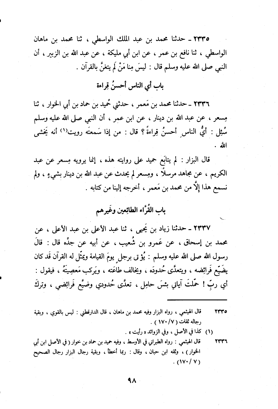 2336 - حَدَّثَنَا مُحَمَّدُ بْنُ مَعْمَرٍ، حَدَّثَنِي حُمَيْدُ بْنُ حَمَّادِ بْنِ أَبِي الْخُوَارِ، ثنا مِسْعَرٌ، عَنْ عَبْدِ اللَّهِ بْنِ دِينَارٍ، عَنِ ابْنِ عُمَرَ، أَنَّ النَّبِيَّ صَلَّى اللَّهُ عَلَيْهِ وَسَلَّمَ سُئِلَ: أَيُّ النَّاسِ أَحْسَنُ قِرَاءَةً؟ قَالَ: «مَنْ إِذَا سَمِعْتَهُ رَأَيْتَ أَنَّهُ يَخْشَى اللَّهَ» .