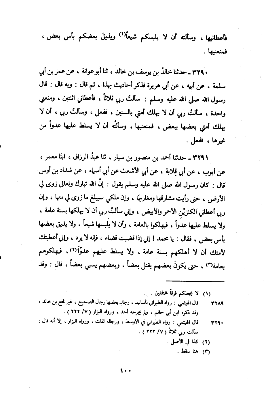 3290 - حَدَّثَنَا خَالِدُ بْنُ يُوسُفَ بْنِ خَالِدٍ، ثنا أَبُو عَوَانَةَ، عَنْ عُمَرَ بْنِ أَبِي سَلَمَةَ، عَنْ أَبِيهِ، عَنْ أَبِي هُرَيْرَةَ، فَذَكَرَ أَحَادِيثَ بِهَذَا، ثُمَّ قَالَ: وَبِهِ قَالَ: قَالَ رَسُولُ اللَّهِ صَلَّى اللَّهُ عَلَيْهِ وَسَلَّمَ: «سَأَلْتُ رَبِّي ثَلاثًا، فَأَعْطَانِي اثْنَتَيْنِ، وَمَنَعَنِي وَاحِدَةً، سَأَلْتُ رَبِّي أَنْ لا يُهْلِكَ أُمَّتِي بِالسِّنِينَ، فَفَعَلَ، وَسَأَلْتُ رَبِّي أَنْ لا يُهْلِكَ أُمَّتِي بَعْضَهَا بِبَعْضٍ فَمَنَعَنِيهَا، وَسَأَلْتُهُ أَنْ لا يُسَلِّطَ عَلَيْهَا عَدُوًّا مِنْ غَيْرِهَا، فَفَعَلَ»