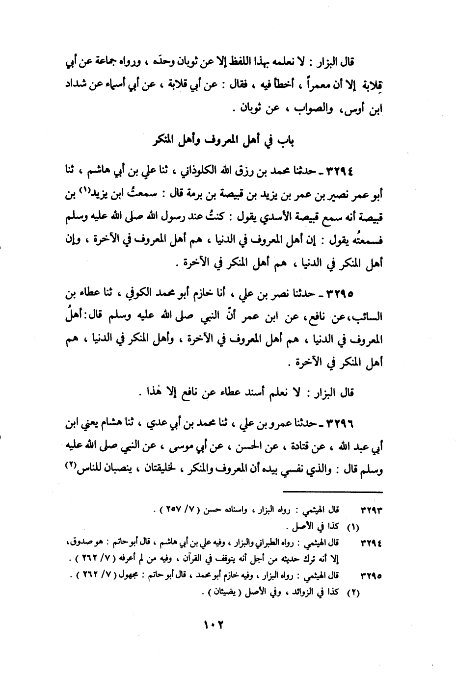 3294 - حَدَّثَنَا مُحَمَّدُ بْنُ رِزْقِ اللَّهِ الْكَلْوَذَانِيُّ، ثنا عَلِيُّ بْنُ أَبِي هَاشِمٍ، ثنا أَبُو عُمَرَ نُصَيْرُ بْنُ عُمَرَ بْنِ يَزِيدَ بْنِ قَبِيصَةَ بْنِ بُرْمَةَ، قَالَ: سَمِعْتُ ابْنَ يَزِيدَ بْنَ قَبِيصَةَ، أَنَّهُ سَمِعَ قَبِيصَةَ الأَسَدِيَّ يَقُولُ: كُنْتُ عِنْدَ رَسُولِ اللَّهِ صَلَّى اللَّهُ عَلَيْهِ وَسَلَّمَ، فَسَمِعْتُهُ يَقُولُ: «إِنَّ أَهْلَ الْمَعْرُوفِ فِي الدُّنْيَا هُمْ أَهْلُ الْمَعْرُوفِ فِي الآخِرَةِ، وَإِنَّ أَهْلَ الْمُنْكَرِ فِي الدُّنْيَا هُمْ أَهْلُ الْمُنْكَرِ فِي الآخِرَةِ»