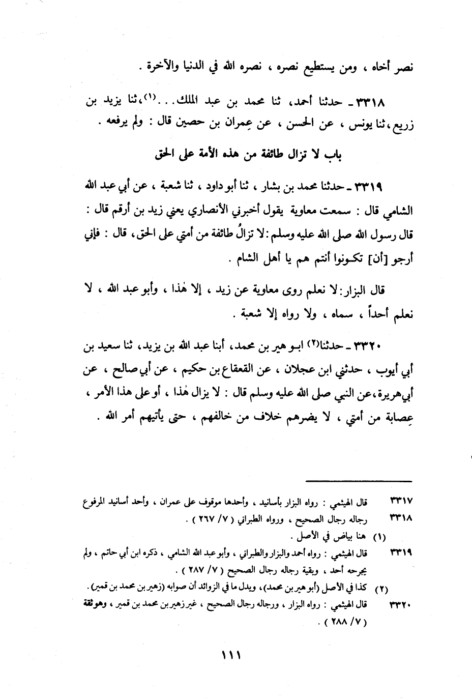 3319 - حَدَّثَنَا مُحَمَّدُ بْنُ بَشَّارٍ، ثنا أَبُو دَاوُدَ، ثنا شُعْبَةُ، عَنْ أَبِي عَبْدِ اللَّهِ الشَّامِيِّ، قَالَ: سَمِعْتُ مُعَاوِيَةَ يَقُولُ: أَخْبَرَنِي الأَنْصَارِيُّ، يَعْنِي: زَيْدَ بْنَ أَرْقَمَ، قَالَ: قَالَ رَسُولُ اللَّهِ صَلَّى اللَّهُ عَلَيْهِ وَسَلَّمَ: " لا تَزَالُ طَائِفَةٌ مِنْ أُمَّتِي عَلَى الْحَقِّ، قَالَ: فَإِنِّي أَرْجُو أَنْ تَكُونُوا أَنْتُمْ هُمْ يَا أَهْلَ الشَّامِ ".