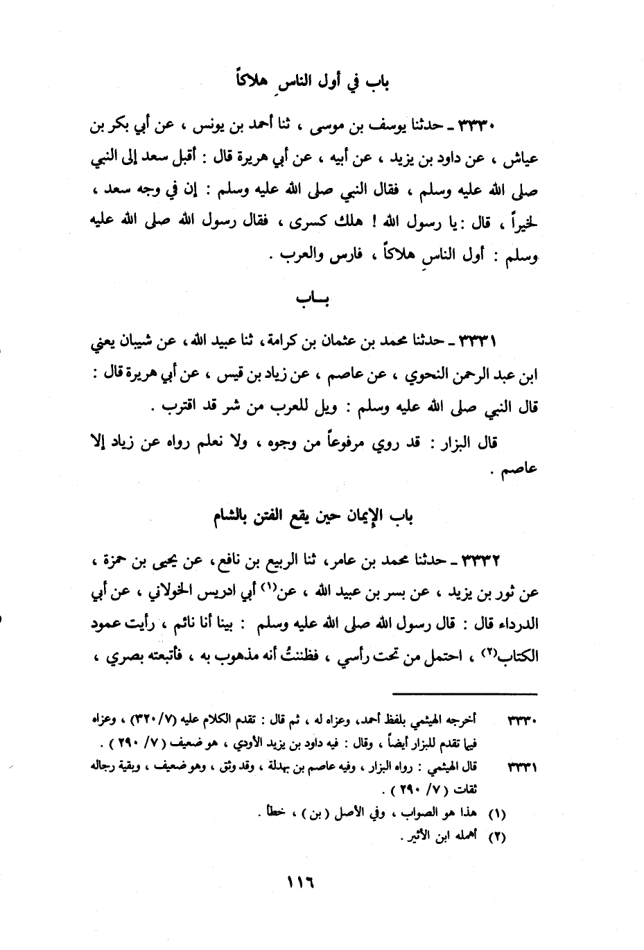3330 - حَدَّثَنَا يُوسُفُ بْنُ مُوسَى، ثنا أَحْمَدُ بْنُ يُونُسَ، عَنْ أَبِي بَكْرِ بْنِ عَيَّاشٍ، عَنْ دَاوُدَ بْنِ يَزِيدَ، عَنْ أَبِيهِ، عَنْ أَبِي هُرَيْرَةَ، قَالَ: أَقْبَلَ سَعْدٌ إِلَى النَّبِيِّ صَلَّى اللَّهُ عَلَيْهِ وَسَلَّمَ، فَقَالَ النَّبِيُّ صَلَّى اللَّهُ عَلَيْهِ وَسَلَّمَ: " إِنَّ فِي وَجْهِ سَعْدٍ لَخَيْرًا، قَالَ: يَا رَسُولَ اللَّهِ! هَلَكَ كِسْرَى، فَقَالَ رَسُولُ اللَّهِ صَلَّى اللَّهُ عَلَيْهِ وَسَلَّمَ: «أَوَّلُ النَّاسِ هَلاكًا فَارِسُ وَالْعَرَبُ»