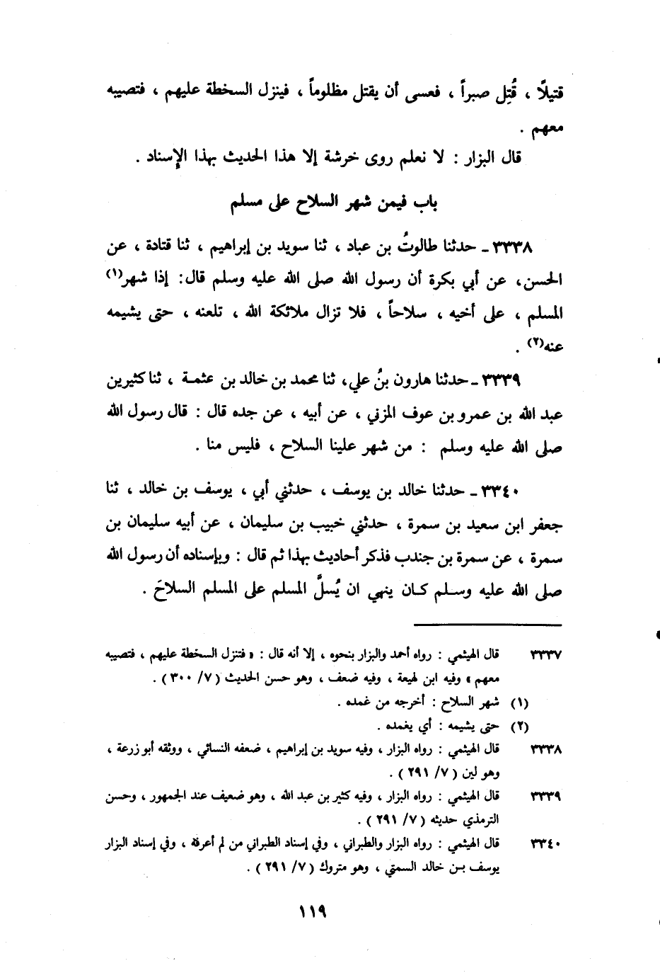 3339 - حَدَّثَنَا هَارُونُ بْنُ عَلِيٍّ، ثنا مُحَمَّدُ بْنُ خَالِدِ بْنِ عَثْمَةَ، ثنا كَثِيرُ بْنُ عَبْدِ اللَّهِ بْنِ عَمْرِو بْنِ عَوْفٍ الْمُزَنِيُّ، عَنْ أَبِيهِ، عَنْ جَدِّهِ، قَالَ: قَالَ رَسُولُ اللَّهِ صَلَّى اللَّهُ عَلَيْهِ وَسَلَّمَ: «مَنْ شَهَرَ عَلَيْنَا السِّلاحَ فَلَيْسَ مِنَّا»