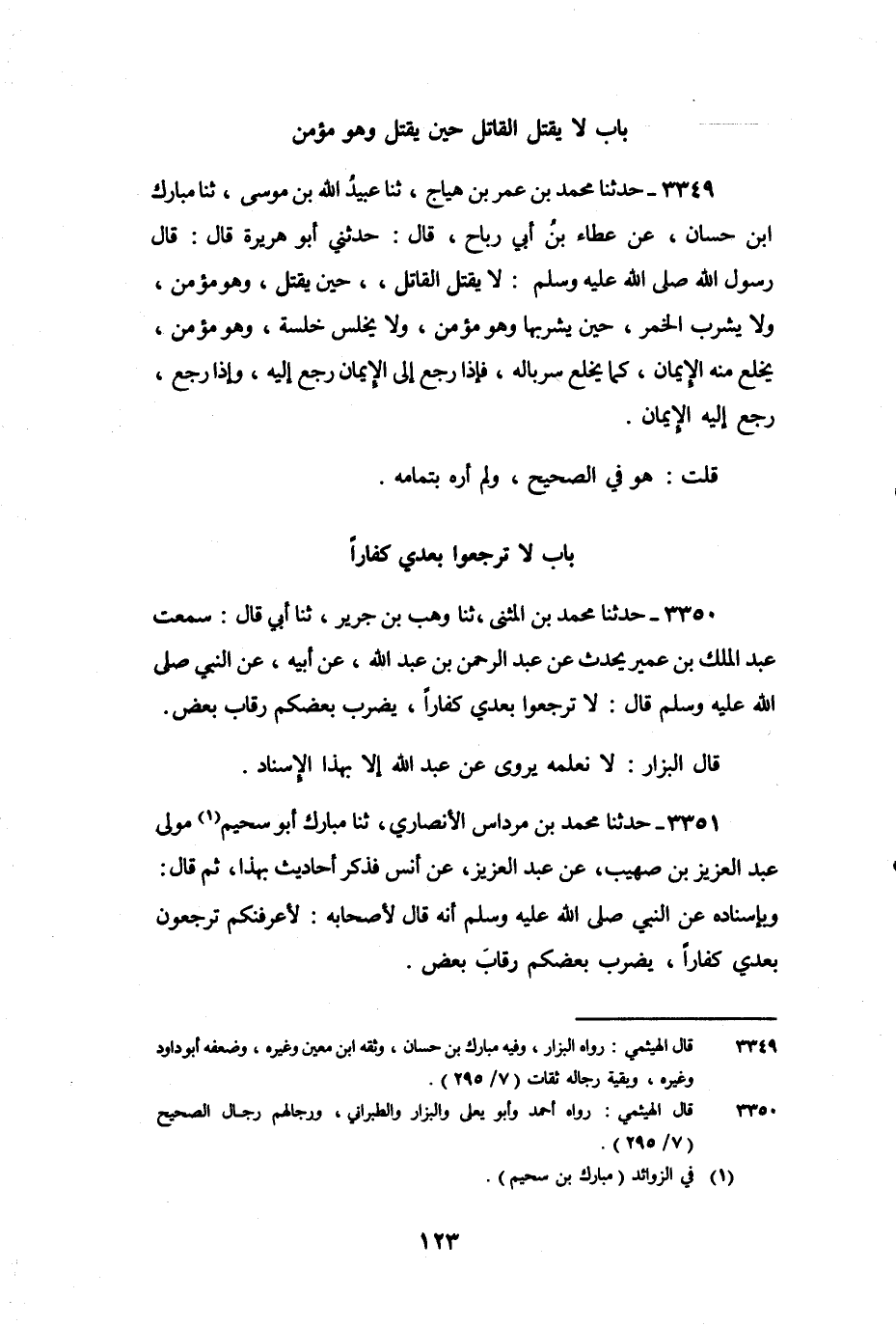 3350 - حَدَّثَنَا مُحَمَّدُ بْنُ الْمُثَنَّى، ثنا وَهْبُ بْنُ جَرِيرٍ، ثنا أَبِي قَالَ: سَمِعْتُ عَبْدَ الْمَلِكِ بْنَ عُمَيْرٍ يُحَدِّثُ , عَنْ عَبْدِ الرَّحْمَنِ بْنِ عَبْدِ اللَّهِ، عَنْ أَبِيهِ، عَنِ النَّبِيِّ صَلَّى اللَّهُ عَلَيْهِ وَسَلَّمَ قَالَ: «لا تَرْجِعُوا بَعْدِي كُفَّارًا، يَضْرِبُ بَعْضُكُمْ رِقَابَ بَعْضٍ» .