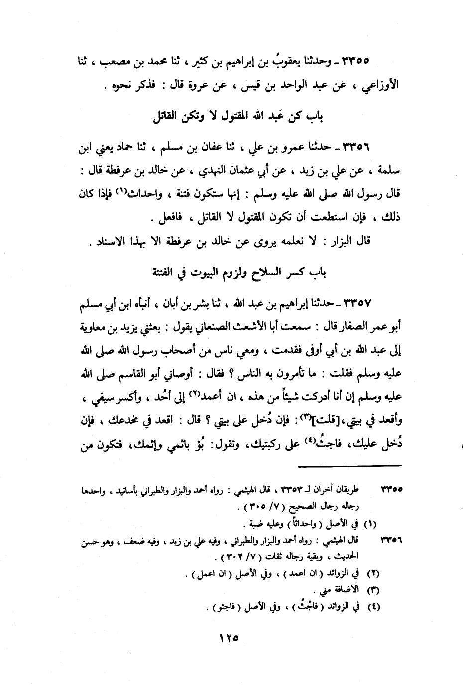 3357 - حَدَّثَنَا إِبْرَاهِيمُ بْنُ عَبْدِ اللَّهِ، ثنا بِشْرُ بْنُ أَبَانٍ، أَنْبَأَهُ ابْنُ أَبِي مُسْلِمٍ أَبُو عُمَرَ الصَّفَّارُ، قَالَ: سَمِعْتُ أَبَا الأَشْعَثِ الصَّنْعَانِيَّ يَقُولُ: بَعَثَنِي يَزِيدُ بْنُ مُعَاوِيَةَ إِلَى عَبْدِ اللَّهِ بْنِ أَبِي أَوْفَى فَقَدِمْتُ، وَمَعِي نَاسٌ مِنْ أَصْحَابِ رَسُولِ اللَّهِ صَلَّى اللَّهُ عَلَيْهِ وَسَلَّمَ , فَقُلْتُ: مَا تَأْمُرُونَ بِهِ النَّاسَ؟ فَقَالَ: أَوْصَانِي أَبُو الْقَاسِمِ صَلَّى اللَّهُ عَلَيْهِ وَسَلَّمَ إِنْ أَنَا أَدْرَكْتُ شَيْئًا مِنْ هَذِهِ، أَنْ أَعْمِدَ إِلَى أُحُدٍ، وَأَكْسِرَ سَيْفِي وَأَقْعُدَ فِي بَيْتِي، قُلْتُ: فَإِنْ دُخِلَ عَلَيَّ بَيْتِي؟ قَالَ: اقْعُدْ فِي مَخْدَعِكَ، فَإِنْ دُخِلَ عَلَيْكَ، فَاجْثُ عَلَى رُكْبَتَيْكَ، وَتَقُولُ: بُؤْ بِإِثْمِي وَإِثْمِكَ، فَتَكُونَ مِنْ