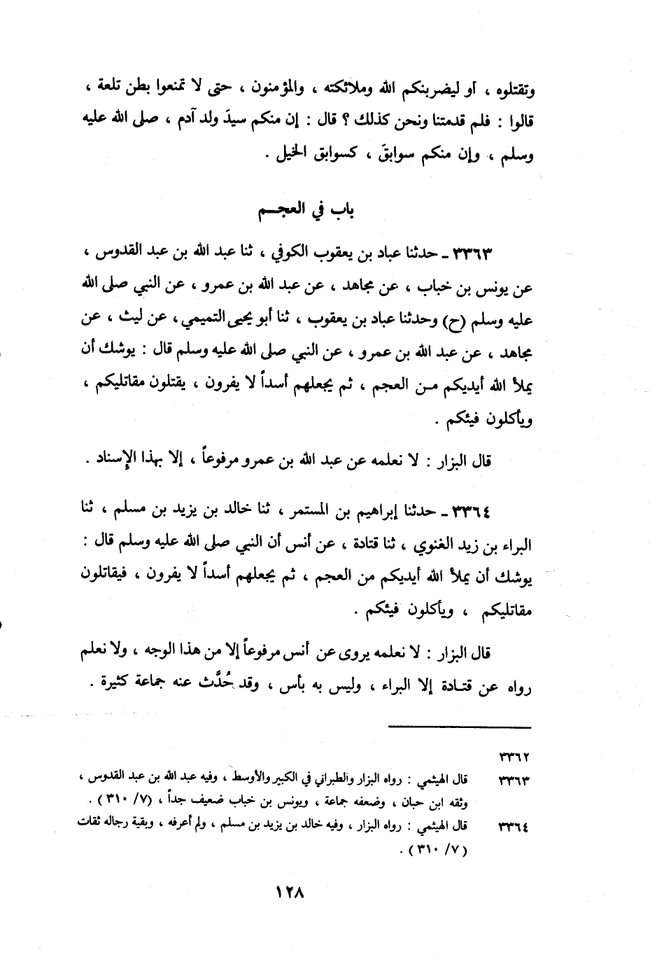 3363 - حَدَّثَنَا عَبَّادُ بْنُ يَعْقُوبَ الْكُوفِيُّ، ثنا عَبْدُ اللَّهِ بْنُ عَبْدِ الْقُدُّوسِ، عَنْ يُونُسَ بْنِ خَبَّابٍ، عَنْ مُجَاهِدٍ، عَنْ عَبْدِ اللَّهِ بْنِ عَمْرٍو، عَنِ النَّبِيِّ صَلَّى اللَّهُ عَلَيْهِ وَسَلَّمَ (ح) وَحَدَّثَنَا عَبَّادُ بْنُ يَعْقُوبَ، ثنا أَبُو يَحْيَى التَّمِيمِيُّ، عَنْ لَيْثٍ، عَنْ مُجَاهِدٍ، عَنْ عَبْدِ اللَّهِ بْنِ عَمْرٍو، عَنِ النَّبِيِّ صَلَّى اللَّهُ عَلَيْهِ وَسَلَّمَ قَالَ: «يُوشَكُ أَنْ يَمْلأَ اللَّهُ أَيْدِيَكُمْ مِنَ الْعَجَمِ، ثُمَّ يَجْعَلَهُمْ أُسْدًا لا يَفِرُّونَ، يَقْتُلُونَ مُقَاتِلِيكُمْ، وَيَأْكُلُونَ فَيْأَكُمْ» .