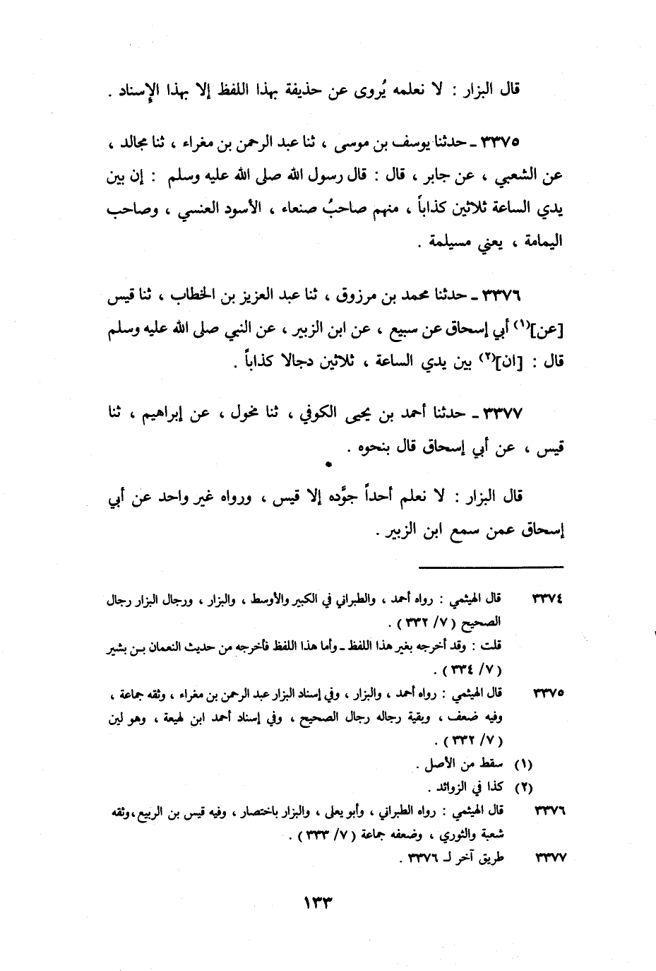 3375 - حَدَّثَنَا يُوسُفُ بْنُ مُوسَى، ثنا عَبْدُ الرَّحْمَنِ بْنُ مَغْرَاءَ، ثنا مُجَالِدٌ، عَنِ الشَّعْبِيِّ، عَنْ جَابِرٍ، قَالَ: قَالَ رَسُولُ اللَّهِ صَلَّى اللَّهُ عَلَيْهِ وَسَلَّمَ: «إِنَّ بَيْنَ يَدَيِ السَّاعَةِ ثَلاثِينَ كَذَّابًا، مِنْهُمْ صَاحِبُ صَنْعَاءَ الأَسْوَدُ الْعَنْسِيُّ، وَصَاحِبُ الْيَمَامَةِ، يَعْنِي مُسَيْلِمَةَ»