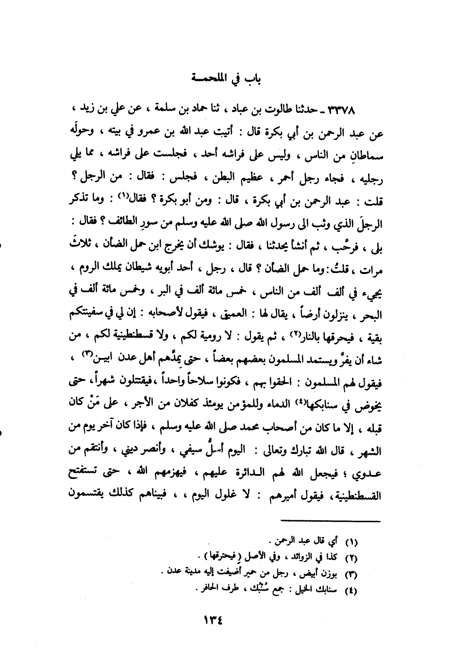 3378 - حَدَّثَنَا طَالُوتُ بْنُ عَبَّادٍ، ثنا حَمَّادُ بْنُ سَلَمَةَ، عَنْ عَلِيِّ بْنِ زَيْدٍ، عَنْ عَبْدِ الرَّحْمَنِ بْنِ أَبِي بَكْرَةَ قَالَ: أَتَيْتُ عَبْدَ اللَّهِ بْنَ عَمْرٍو فِي بَيْتِهِ، وَحَوْلَهُ سِمَاطَانِ مِنَ النَّاسِ، وَلَيْسَ عَلَى فِرَاشِهِ أَحَدٌ، فَجَلَسْتُ عَلَى فِرَاشِهِ، مِمَّا يَلِي رِجْلَيْهِ، فَجَاءَ رَجُلٌ أَحْمَرُ، عَظِيمُ الْبَطْنِ، فَجَلَسَ: فَقَالَ: مَنِ الرَّجُلُ؟ قُلْتُ: عَبْدُ الرَّحْمَنِ بْنُ أَبِي بَكْرَةَ، قَالَ: وَمَنْ أَبُو بَكْرَةَ؟ فَقَالَ: وَمَا تَذْكُرُ الرَّجُلَ الَّذِي وَثَبَ إِلَى رَسُولِ اللَّهِ صَلَّى اللَّهُ عَلَيْهِ وَسَلَّمَ مِنْ سُورِ الطَّائِفِ؟ فَقَالَ: بَلَى، فَرَحَّبَ، ثُمَّ أَنْشَأَ يُحَدِّثُنَا، فَقَالَ: يُوشَكُ أَنْ يَخْرُجَ ابْنُ حَمَلِ الضَّأْنِ، ثَلاثَ مَرَّاتٍ، قُلْتُ: وَمَا حَمَلُ الضَّأْنِ؟ قَالَ: رَجُلٌ أَحَدُ أَبَوَيْهِ شَيْطَانٌ يَمْلِكُ الرُّومَ، يَجِيءُ فِي أَلْفِ أَلْفٍ مِنَ النَّاسِ، خَمْسُ مِائَةِ أَلْفٍ فِي الْبَرِّ، وَخَمْسُ مِائَةٍ فِي الْبَحْرِ، يَنْزِلُونَ أَرْضًا، يُقَالَ لَهَا: الْعَمِيقُ، فَيَقُولُ لأَصْحَابِهِ: إِنَّ لِي فِي سَفِينَتِكُمْ بَقِيَّةً، فَيُحْرِقُهَا بِالنَّارِ، ثُمَّ يَقُولُ: لا رُومِيَّةَ لَكُمْ، وَلا قُسْطَنْطِينِيَّةَ لَكُمْ، مَنْ شَاءَ أَنْ يَفِرَّ وَيَسْتَمِدَّ الْمُسْلِمُونَ بَعْضُهُمْ بَعْضًا، حَتَّى يَمِدَّهُمْ أَهْلُ عَدَنِ أَبْيَنَ، فَيَقُولُ لَهُمُ الْمُسْلِمُونَ: الْحَقُوا بِهِمْ، فَكُونُوا سِلاحًا وَاحِدًا، فَيَقْتَتِلُونَ شَهْرًا، حَتَّى يَخُوضَ فِي سَنَابِكِهَا الدِّمَاءُ وَلِلْمُؤْمِنِ يَوْمَئِذٍ كِفْلانِ مِنَ الأَجْرِ، عَلَى مَنْ كَانَ قَبْلَهُ، إِلا مَا كَانَ مِنْ أَصْحَابِ مُحَمَّدٍ صَلَّى اللَّهُ عَلَيْهِ وَسَلَّمَ، فَإِذَا كَانَ آخِرُ يَوْمٍ مِنَ الشَّهْرِ، قَالَ اللَّهُ تَبَارَكَ وَتَعَالَى: الْيَوْمَ أَسُلُّ سَيْفِي، وَأَنْصُرُ دِينِي، وَأَنْتَقِمُ مِنْ عَدُوِّي، فَيَجْعَلُ اللَّهُ لَهُمْ الدَّائِرَةَ عَلَيْهِمْ، فَيَهْزِمُهُمُ اللَّهُ، حَتَّى تُسْتَفْتَحَ الْقُسْطَنْطِينِيَّةُ، فَيَقُولُ أَمِيرُهُمْ: لا غُلُولَ الْيَوْمَ، فَبَيْنَا هُمْ كَذَلِكَ يَقْتَسِمُونَ