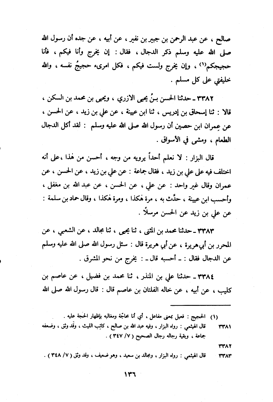 3382 - حَدَّثَنَا الْحَسَنُ بْنُ يَحْيَى الأُزُرِيُّ، وَيَحْيَى بْنُ مُحَمَّدِ بْنِ السَّكَنِ، قَالا: ثنا إِسْحَاقُ بْنُ إِدْرِيسَ، ثنا ابْنُ عُيَيْنَةَ، عَنْ عَلِيِّ بْنِ زَيْدٍ، عَنِ الْحَسَنِ، عَنْ عِمْرَانَ بْنِ حُصَيْنٍ، أَنَّ رَسُولَ اللَّهِ صَلَّى اللَّهُ عَلَيْهِ وَسَلَّمَ قَالَ: «لَقَدْ أَكَلَ الدَّجَّالُ الطَّعَامَ، وَمَشَى فِي الأَسْوَاقِ» .