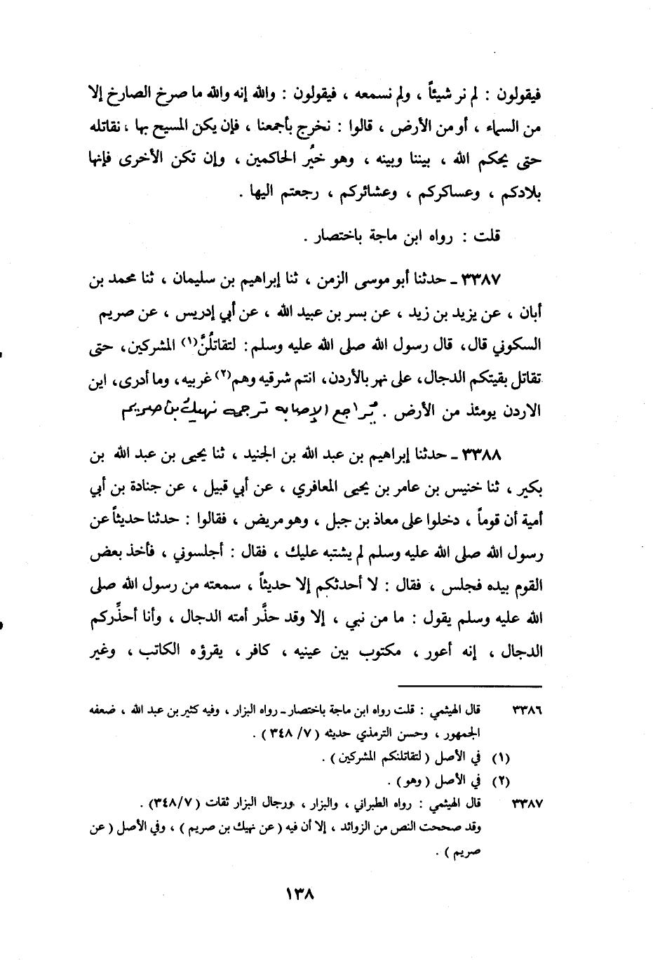 3387 - حَدَّثَنَا أَبُو مُوسَى الزَّمِنُ، ثنا إِبْرَاهِيمُ بْنُ سُلَيْمَانَ، ثنا مُحَمَّدُ بْنُ أَبَانٍ، عَنْ يَزِيدَ بْنِ زَيْدٍ، عَنْ بُسْرِ بْنِ عُبَيْدِ اللَّهِ، عَنْ أَبِي إِدْرِيسَ، عَنْ صُرَيْمٍ السَّكُونِيِّ، قَالَ: قَالَ رَسُولُ اللَّهِ صَلَّى اللَّهُ عَلَيْهِ وَسَلَّمَ: «لَتُقَاتِلُنَّ الْمُشْرِكِينَ، حَتَّى تُقَاتِلَ بَقِيَّتُكُمُ الدَّجَّالَ، عَلَى نَهْرٍ بِالأُرْدُنِّ، أَنْتُمْ شَرْقِيَّهُ وَهُمْ غَرْبِيَّهُ، وَمَا أَدْرِي، أَيْنَ الأُرْدُنُّ يَوْمَئِذٍ مِنَ الأَرْضِ»