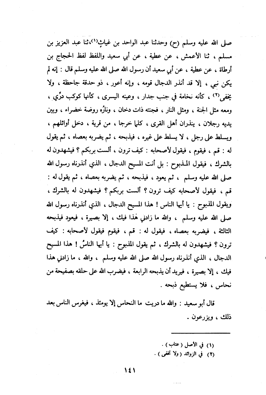 صَلَّى اللَّهُ عَلَيْهِ وَسَلَّمَ (ح) وَحَدَّثَنَا عَبْدُ الْوَاحِدِ بْنُ غِيَاثٍ، ثنا عَبْدُ الْعَزِيزِ بْنُ مُسْلِمٍ، ثنا الأَعْمَشُ، عَنْ عَطِيَّةَ، عَنْ أَبِي سَعِيدٍ وَاللَّفْظُ لَفْظُ الْحَجَّاجِ بْنِ أَرْطَأَةَ، عَنْ عَطِيَّةَ، عَنْ أَبِي سَعِيدٍ , أَنَّ رَسُولَ اللَّهِ صَلَّى اللَّهُ عَلَيْهِ وَسَلَّمَ قَالَ: " إِنَّهُ لَمْ يَكُنْ نَبِيٌّ إِلا قَدْ أَنْذَرَ الدَّجَّالَ قَوْمَهُ، وَإِنَّهُ أَعْوَرُ، ذُو حَدَقَةٍ جَاحِظَةٍ، وَلا تَخْفَى، كَأَنَّهُ نُخَامَةٌ فِي جَنْبِ جِدَارٍ، وَعَيْنُهُ الْيُسْرَى، كَأَنَّهَا كَوْكَبٌ دُرِّيٌّ، وَمَعَهُ مِثْلُ الْجَنَّةِ، وَمِثْلُ النَّارِ، فَجَنَّتُهُ ذَاتُ دُخَانٍ، وَنَارُهُ رَوْضَةٌ خَضْرَاءُ، وَبَيْنَ يَدَيْهِ رَجُلانِ، يُنْذِرَانِ أَهْلَ الْقُرَى، كُلَّمَا خَرَجَا مِنْ قَرْيَةٍ، دَخَلَ أَوَائِلُهُمْ، وَيُسَلَّطُ عَلَى رَجُلٍ، لا يُسَلَّطُ عَلَى غَيْرِهِ، فَيَذْبَحُهُ، ثُمَّ يَضْرِبُهُ بِعَصَاهُ، ثُمَّ يَقُولُ لَهُ: قُمْ، فَيَقُولُ لأَصْحَابِهِ: كَيْفَ تَرَوْنَ، أَلَسْتُ بِرَبِّكُمْ؟ فَيَشْهَدُونَ لَهُ بِالشِّرْكِ، فَيَقُولُ الْمَذْبُوحُ: بَلْ أَنْتَ الْمَسِيحُ الدَّجَّالُ، الَّذِي أَنْذَرَنَاهُ رَسُولُ اللَّهِ صَلَّى اللَّهُ عَلَيْهِ وَسَلَّمَ، ثُمَّ يَعُودُ، فَيَذْبَحُهُ، ثُمَّ يَضْرِبُهُ بِعَصَاهُ، ثُمَّ يَقُولُ لَهُ: قُمْ، فَيَقُولُ لأَصْحَابِهِ كَيْفَ تَرَوْنَ؟ أَلَسْتُ بِرَبِّكُمْ؟ فَيَشْهَدُونَ لَهُ بِالشِّرْكِ وَيَقُولُ الْمَذْبُوحُ: يَأَيُّهَا النَّاسُ! هَذَا الْمَسِيحُ الدَّجَّالُ، الَّذِي أَنْذَرَنَاهُ رَسُولُ اللَّهِ صَلَّى اللَّهُ عَلَيْهِ وَسَلَّمَ، وَاللَّهِ مَا زَادَنِي هَذَا فِيكَ، إِلا بَصِيرَةً، فَيَعُودُ فَيَذْبَحُهُ الثَّالِثَةَ، فَيَضْرِبُهُ بِعَصَاهُ، فَيَقُولُ لَهُ: قُمْ، فَيَقُومُ، فَيَقُولُ لأَصْحَابِهِ: كَيْفَ تَرَوْنَ؟ فَيَشْهَدُونَ لَهُ بِالشِّرْكِ، ثُمَّ يَقُولُ الْمَذْبُوحُ: يَأَيُّهَا النَّاسُ! هَذَا الْمَسِيحُ الدَّجَّالُ، الَّذِي أَنْذَرَنَاهُ رَسُولُ اللَّهِ صَلَّى اللَّهُ عَلَيْهِ وَسَلَّمَ، وَاللَّهِ مَا زَادَنِي هَذَا فِيكَ إِلا بَصِيرَةً، فَيُرِيدُ أَنْ يَذْبَحَهُ الرَّابِعَةَ، فَيَضْرِبُ اللَّهُ عَلَى حَلْقِهِ بِصَفِيحَةٍ مِنْ نُحَاسٍ، فَلا يَسْتَطِيعُ ذَبْحَهُ ".