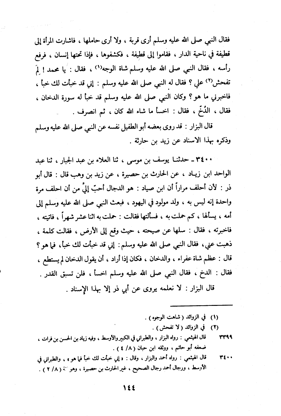 3400 - حَدَّثَنَا يُوسُفُ بْنُ مُوسَى، ثنا الْعَلاءُ بْنُ عَبْدِ الْجَبَّارِ، ثنا عَبْدُ الْوَاحِدِ بْنُ زِيَادٍ، عَنِ الْحَارِثِ بْنِ حَصِيرَةَ، عَنْ زَيْدِ بْنِ وَهْبٍ، قَالَ: قَالَ أَبُو ذَرٍّ: لأَنْ أَحْلِفَ مِرَارًا أَنَّ ابْنَ صِيَادٍ: هُوَ الدَّجَّالُ أَحَبُّ إِلَيَّ مِنْ أَنْ أَحْلِفَ مَرَّةً وَاحِدَةً إِنَّهُ لَيْسَ بِهِ، وُلِدَ مَوْلُودٌ فِي الْيَهُودِ، فَبَعَثَ النَّبِيُّ صَلَّى اللَّهُ عَلَيْهِ وَسَلَّمَ إِلَى أُمِّهِ، يَسْأَلُهَا، كَمْ حَمِلَتْ بِهِ، فَسَأَلْتُهَا فَقَالَتْ: حَمِلْتُ بِهِ اثْنَا عَشَرَ شَهْرًا، فَأَتَيْتُهُ، فَأَخْبَرْتُهُ، فَقَالَ: سَلْهَا عَنْ صَيْحَتِهِ، حَيْثُ وَقَعَ إِلَى الأَرْضِ، فَقَالَتْ كَلِمَةً، ذَهَبَتْ عَنِّي، فَقَالَ النَّبِيُّ صَلَّى اللَّهُ عَلَيْهِ وَسَلَّمَ: " إِنِّي قَدْ خَبَّأْتُ لَكَ خَبْئًا، فَمَا هُوَ؟ قَالَ: عَظْمَ شَاةٍ عَفْرَاءَ، وَالدُّخَانَ، فَكَانَ إِذَا أَرَادَ أَنْ يَقُولَ الدُّخَانَ لَمْ يَسْتَطِعْ، فَقَالَ: الدُّخْ، فَقَالَ النَّبِيُّ صَلَّى اللَّهُ عَلَيْهِ وَسَلَّمَ اخْسَأْ، فَلَنْ تَسْبِقَ الْقَدَرَ ".