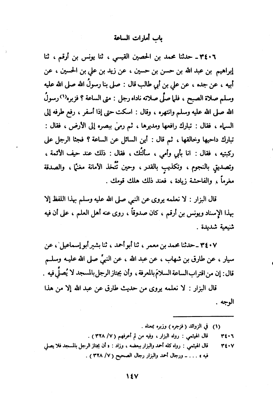 3406 - حَدَّثَنَا مُحَمَّدُ بْنُ الْحُصَيْنِ الْقَيْسِيُّ، ثنا يُونُس بْنُ أَرْقَمَ، ثنا إِبْرَاهِيمُ بْنُ عَبْدِ اللَّهِ بْنِ حَسَنِ بْنِ حُسَيْنٍ، عَنْ زَيْدِ بْنِ عَلِيِّ بْنِ الْحُسَيْنِ، عَنْ أَبِيهِ، عَنْ جَدِّهِ، عَنْ عَلِيِّ بْنِ أَبِي طَالِبٍ، قَالَ: صَلَّى بِنَا رَسُولُ اللَّهِ صَلَّى اللَّهُ عَلَيْهِ وَسَلَّمَ صَلاةَ الصُّبْحِ، فَلَمَّا صَلَّى صَلاتَهُ نَادَاهُ رَجُلٌ: مَتَى السَّاعَةُ؟ فَزَبَرَهُ رَسُولُ اللَّهِ صَلَّى اللَّهُ عَلَيْهِ وَسَلَّمَ، وَانْتَهَرَهُ، وَقَالَ: " اسْكُتْ حَتَّى إِذَا أَسْفَرَ رَفَعَ طَرْفَهُ إِلَى السَّمَاءِ، فَقَالَ: تَبَارَكَ رَافِعُهَا وَمُدِيرُهَا، ثُمَّ رَمَى بِبَصَرِهِ إِلَى الأَرْضِ، فَقَالَ: تَبَارَكَ دَاحِيهَا وَخَالِقُهَا، ثُمَّ قَالَ: أَيْنَ السَّائِلُ عَنِ السَّاعَةِ؟ فَجَثَا الرَّجُلُ عَلَى رُكْبَتَيْهِ، فَقَالَ: أَنَا بِأَبِي وَأُمِّي، سَأَلْتُكَ، فَقَالَ: ذَلِكَ عِنْدَ حَيْفِ الأَئِمَّةِ، وَتَصْدِيقٍ بِالنُّجُومِ، وَتَكْذِيبٍ بِالْقَدَرِ، وَحِينَ تُتَّخَذُ الأَمَانَةُ مَغْنَمًا، وَالصَّدَقَةُ مَغْرَمًا، وَالْفَاحِشَةُ زِيَادَةٌ، فَعِنْدَ ذَلِكَ هَلَكَ قَوْمُكَ ".