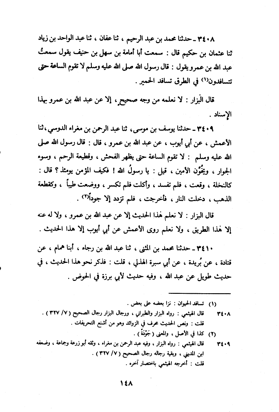 3408 - حَدَّثَنَا مُحَمَّدُ بْنُ عَبْدِ الرَّحِيمِ، ثنا عَفَّانُ، ثنا عَبْدُ الْوَاحِدِ بْنُ زِيَادٍ، ثنا عُثْمَانُ بْنُ حَكِيمٍ، قَالَ: سَمِعْتُ أَبَا أُمَامَةَ بْنَ سَهْلِ بْنِ حَنِيفٍ يَقُولُ: سَمِعْتُ عَبْدَ اللَّهِ بْنَ عَمْرٍو , يَقُولُ: قَالَ رَسُولُ اللَّهِ صَلَّى اللَّهُ عَلَيْهِ وَسَلَّمَ: «لا تَقُومُ السَّاعَةُ حَتَّى تَتَسَافَدُونَ فِي الطُّرُقِ تَسَافُدَ الْحَمِيرِ» .