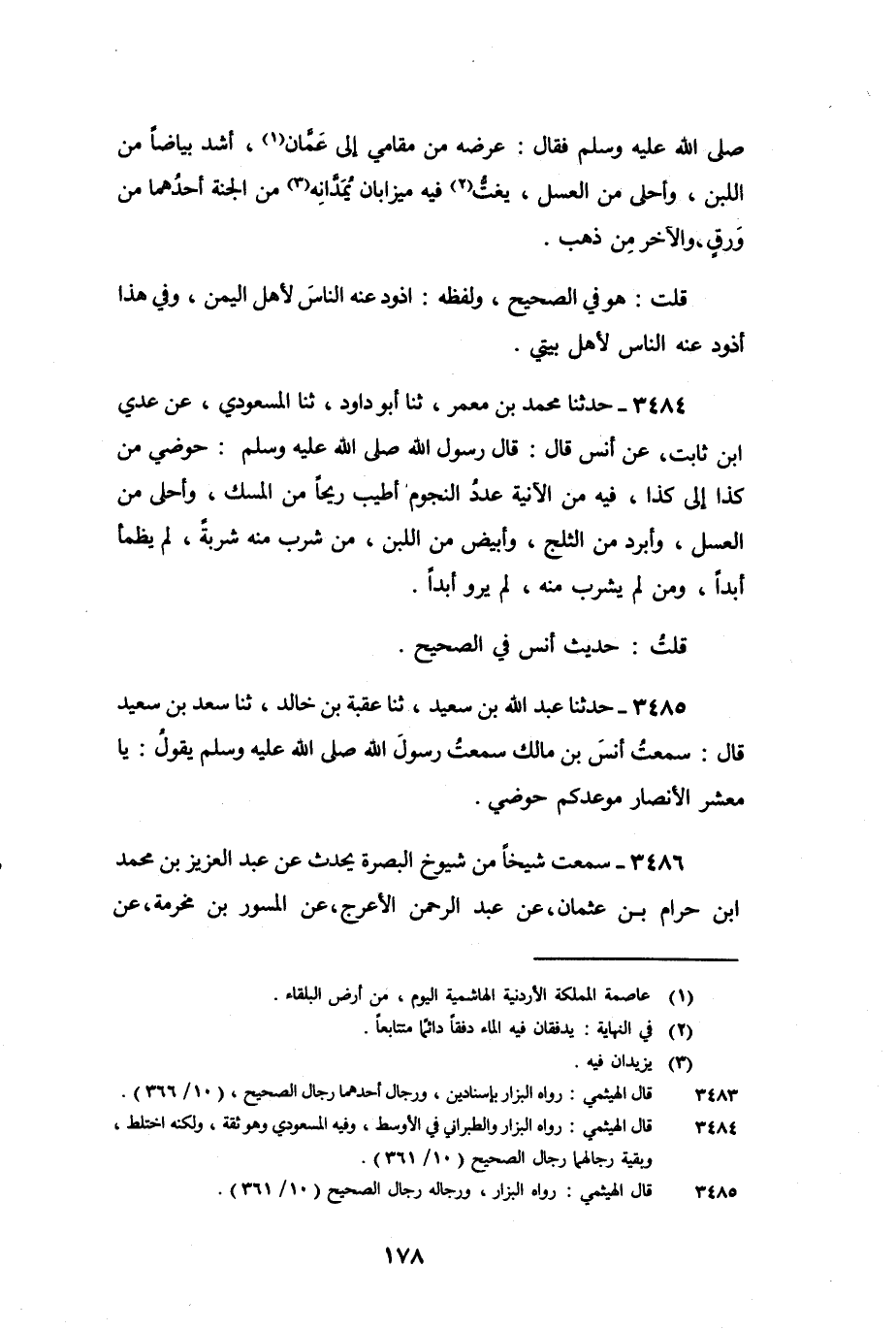 3484 - حَدَّثَنَا مُحَمَّدُ بْنُ مَعْمَرٍ، ثنا أَبُو دَاوُدَ، ثنا الْمَسْعُودِيُّ، عَنْ عَدِيِّ بْنِ ثَابِتٍ، عَنْ أَنَسٍ، قَالَ: قَالَ رَسُولُ اللَّهِ صَلَّى اللَّهُ عَلَيْهِ وَسَلَّمَ: «حَوْضِي مِنْ كَذَا إِلَى كَذَا، فِيهِ مِنَ الآنِيَةِ عَدَدُ النُّجُومِ، أَطْيَبُ رِيحًا مِنَ الْمِسْكِ، وَأَحْلَى مِنَ الْعَسَلِ، وَأَبْرَدُ مِنَ الثَّلَجِ، وَأَبْيَضُ مِنَ اللَّبَنِ، مَنْ شَرِبَ مِنْهُ شَرْبَةً لَمْ يَظْمَأْ أَبَدًا، وَمَنْ لَمْ يَشْرَبْ مِنْهُ لَمْ يَرْوَ أَبَدًا» .