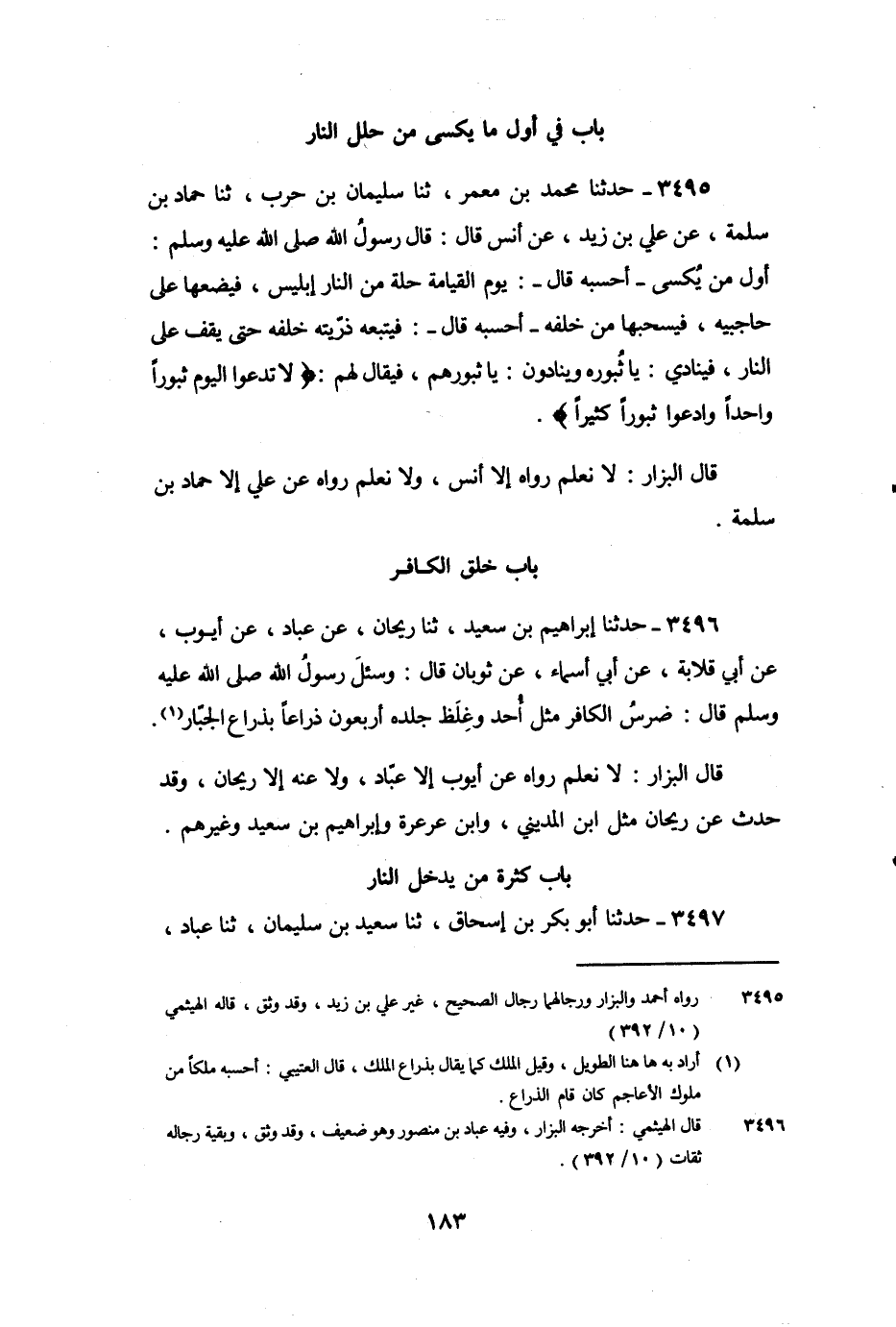 3495 - حَدَّثَنَا مُحَمَّدُ بْنُ مَعْمَرٍ، ثنا سُلَيْمَانُ بْنُ حَرْبٍ، ثنا حَمَّادُ بْنُ سَلَمَةَ، عَنْ عَلِيِّ بْنِ زَيْدٍ، عَنْ أَنَسٍ، , قَالَ: قَالَ رَسُولُ اللَّهِ صَلَّى اللَّهُ عَلَيْهِ وَسَلَّمَ: " أَوَّلُ مَنْ يُكْسَى، أَحْسِبُهُ قَالَ: يَوْمَ الْقِيَامَةِ، حُلَّةً مِنَ النَّارِ إِبْلِيسُ، فَيَضَعُهَا عَلَى حَاجِبَيْهِ، فَيَسْحَبُهَا مِنْ خَلْفِهِ، أَحْسِبُهُ قَالَ: فَيَتْبَعُهُ ذُرِّيَّتُهُ خَلْفَهُ، حَتَّى يَقِفَ عَلَى النَّارِ، فَيُنَادِيَ: يَا ثُبُورَهُ، وَيُنَادُونَ: يَا ثُبُورَهُمْ، فَيُقَالُ لَهُمْ: {لا تَدْعُوا الْيَوْمَ ثُبُورًا وَاحِدًا وَادْعُوا ثُبُورًا كَثِيرًا} [الفرقان: 14] ".