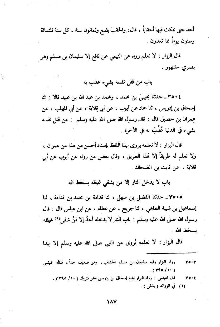 3504 - حَدَّثَنَا يَحْيَى بْنُ مُحَمَّدٍ، وَمُحَمَّدُ بْنُ عَبْدِ اللَّهِ بْنِ عُبَيْدٍ، قَالا: ثنا إِسْحَاقُ بْنُ إِدْرِيسَ، ثنا حَمَّادُ، عَنْ أَيُّوبَ، عَنْ أَبِي قِلابَةَ، عَنْ أَبِي الْمُهَلَّبِ، عَنْ عِمْرَانَ بْنِ حُصَيْنٍ، قَالَ: قَالَ رَسُولُ اللَّهِ صَلَّى اللَّهُ عَلَيْهِ وَسَلَّمَ: «مَنْ قَتَلَ نَفَسْهُ بِشَيْءٍ فِي الدُّنْيَا عُذِّبَ بِهِ فِي الآخِرَةِ» .
