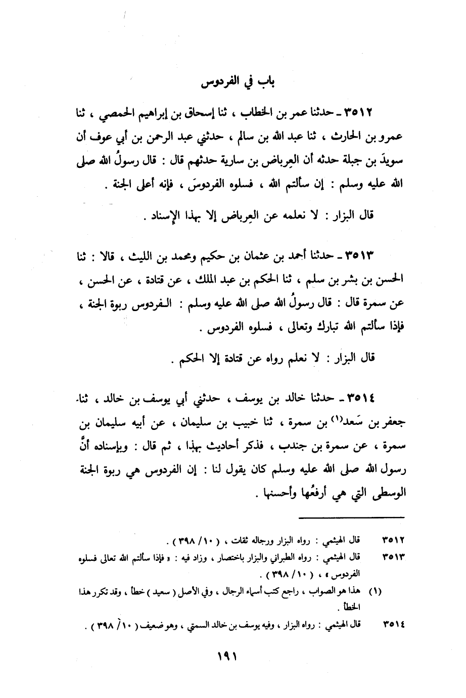 3514 - حَدَّثَنَا خَالِدُ بْنُ يُوسُفَ، حَدَّثَنِي أَبِي يُوسُفُ بْنُ خَالِدٍ، ثنا جَعْفَرُ بْنُ سَعْدِ بْنِ سَمُرَةَ، ثنا خُبَيْبُ بْنُ سُلَيْمَانَ، عَنْ أَبِيهِ سُلَيْمَانَ بْنِ سَمُرَةَ، عَنْ سَمُرَةَ بْنِ جُنْدُبٍ، فَذَكَرَ أَحَادِيثَ بِهَذَا، ثُمَّ قَالَ: وَبِإِسْنَادِهِ أَنَّ رَسُولَ اللَّهِ صَلَّى اللَّهُ عَلَيْهِ وَسَلَّمَ، كَانَ يَقُولُ لَنَا: «إِنَّ الْفِرْدَوْسَ هِيَ رَبْوَةُ الْجَنَّةِ الْوُسْطَى، الَّتِي هِيَ أَرْفَعُهَا وَأَحْسَنُهَا»