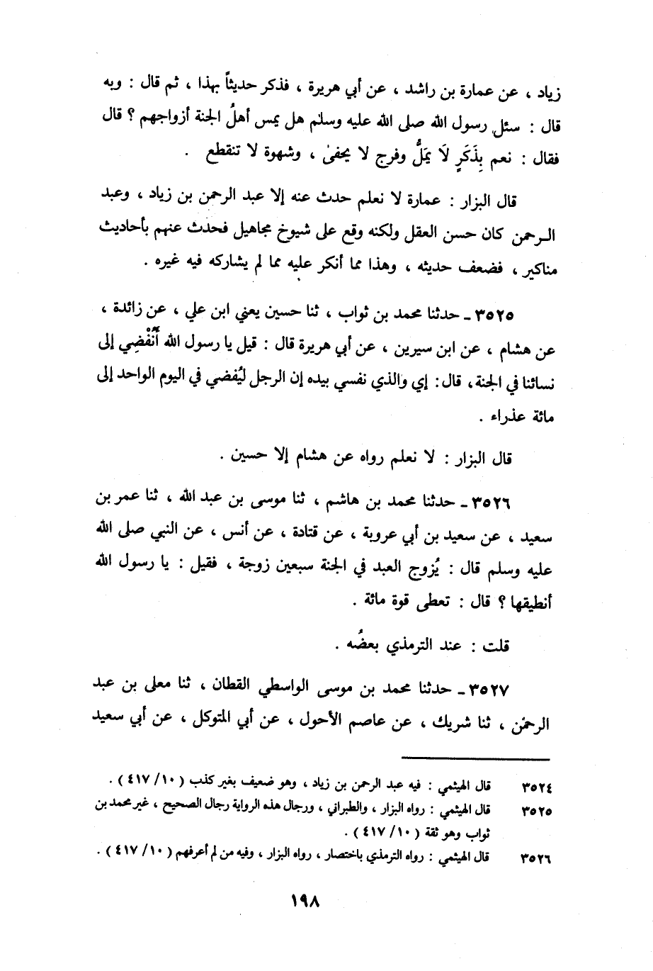 زِيَادٍ، عَنْ عُمَارَةَ بْنِ رَاشِدٍ، عَنْ أَبِي هُرَيْرَةَ، فَذَكَرَ حَدِيثًا بِهَذَا، ثُمَّ قَالَ: وَبِهِ قَالَ: سُئِلَ رَسُولُ اللَّهِ صَلَّى اللَّهُ عَلَيْهِ وَسَلَّمَ: هَلْ يَمَسُّ أَهْلُ الْجَنَّةِ أَزْوَاجَهُمْ؟ قَالَ: فَقَالَ: «نَعَمْ بِذَكَرٍ لا يَمَلُّ، وَفَرْجٍ لا يَحْفَى، وَشَهْوَةٍ لا تَنْقَطِعُ» .