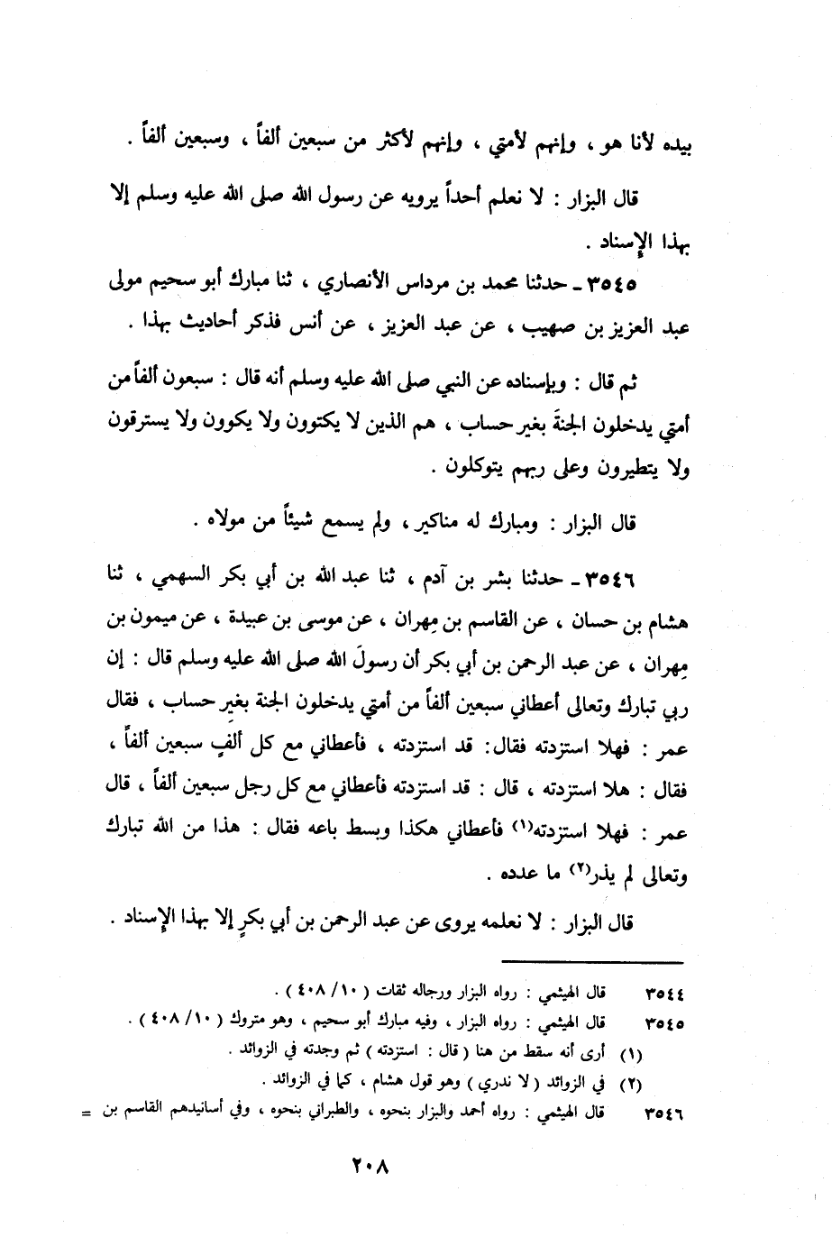 3546 - حَدَّثَنَا بِشْرُ بْنُ آدَمَ، ثنا عَبْدُ اللَّهِ بْنُ أَبِي بَكْرٍ السَّهْمِيُّ، ثنا هِشَامُ بْنُ حَسَّانٍ، عَنِ الْقَاسِمِ بْنِ مِهْرَانَ، عَنْ مُوسَى بْنِ عُبَيْدَةَ، عَنْ مَيْمُونِ بْنِ مِهْرَانَ، عَنْ عَبْدِ الرَّحْمَنِ بْنِ أَبِي بَكْرٍ، أَنَّ رَسُولَ اللَّهِ صَلَّى اللَّهُ عَلَيْهِ وَسَلَّمَ قَالَ: " إِنَّ رَبِّي تَبَارَكَ وَتَعَالَى أَعْطَانِي سَبْعِينَ أَلْفًا مِنْ أُمَّتِي يَدْخُلُونَ الْجَنَّةَ بِغَيْرِ حِسَابٍ، فَقَالَ عُمَرُ: فَهَلا اسْتَزَدْتَهُ، فَقَالَ: قَدِ اسْتَزَدْتُهُ، فَأَعْطَانِي مَعَ كُلِّ أَلْفٍ سَبْعِينَ أَلْفًا، فَقَالَ: هَلا اسْتَزَدْتَهُ، قَالَ: قَدِ اسْتَزَدْتُهُ، فَأَعْطَانِي مَعَ كُلِّ رَجُلٍ سَبْعِينَ أَلْفًا، قَالَ عُمَرُ: فَهَلا اسْتَزَدْتُهُ، قَالَ: اسْتَزَدْتُهُ، فَأَعْطَانِي هَكَذَا، وَبَسَطَ بَاعَهُ، فَقَالَ: هَذَا مِنَ اللَّهِ تَبَارَكَ وَتَعَالَى، لَمْ نَدْرِ مَا عَدَدُهُ.