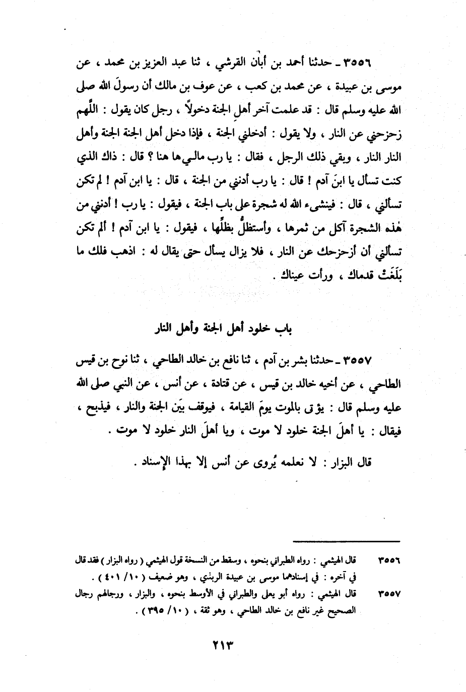 3557 - حَدَّثَنَا بِشْرُ بْنُ آدَمَ، ثنا نَافِعُ بْنُ خَالِدٍ الطَّاحِيُّ، ثنا نُوحُ بْنُ قَيْسٍ الطَّاحِيُّ، عَنْ أَخِيهِ خَالِدِ بْنِ قَيْسٍ، عَنْ قَتَادَةَ، عَنْ أنَسٍ، عَنِ النَّبِيِّ صَلَّى اللَّهُ عَلَيْهِ وَسَلَّمَ قَالَ: " يُؤْتَى بِالْمَوْتِ يَوْمَ الْقِيَامَةِ، فَيُوقَفُ بَيْنَ الْجَنَّةِ وَالنَّارِ، فَيُذْبَحُ، فَيُقَالُ: يَا أَهْلَ الْجَنَّةِ خُلُودٌ لا مَوْتَ، وَيَا أَهْلَ النَّارِ خُلُودٌ لا مَوْتَ ".