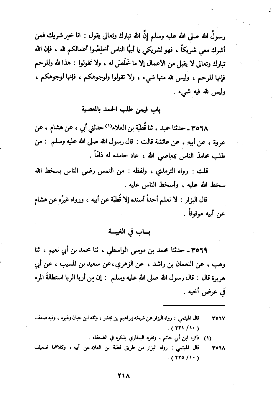 3568 - حَدَّثَنَا حُمَيْدٌ، ثنا قُطْبَةُ بْنُ الْعَلاءِ، حَدَّثَنِي أَبِي، عَنْ هِشَامٍ بن عُرْوَةَ، عَنْ أَبِيهِ، عَنْ عَائِشَةَ، قَالَتْ: قَالَ رَسُولُ اللَّهِ صَلَّى اللَّهُ عَلَيْهِ وَسَلَّمَ: «مَنْ طَلَبَ مَحَامِدَ النَّاسِ بِمَعَاصِي اللَّهِ، عَادَ حَامِدُهُ لَهُ ذَامًّا» .