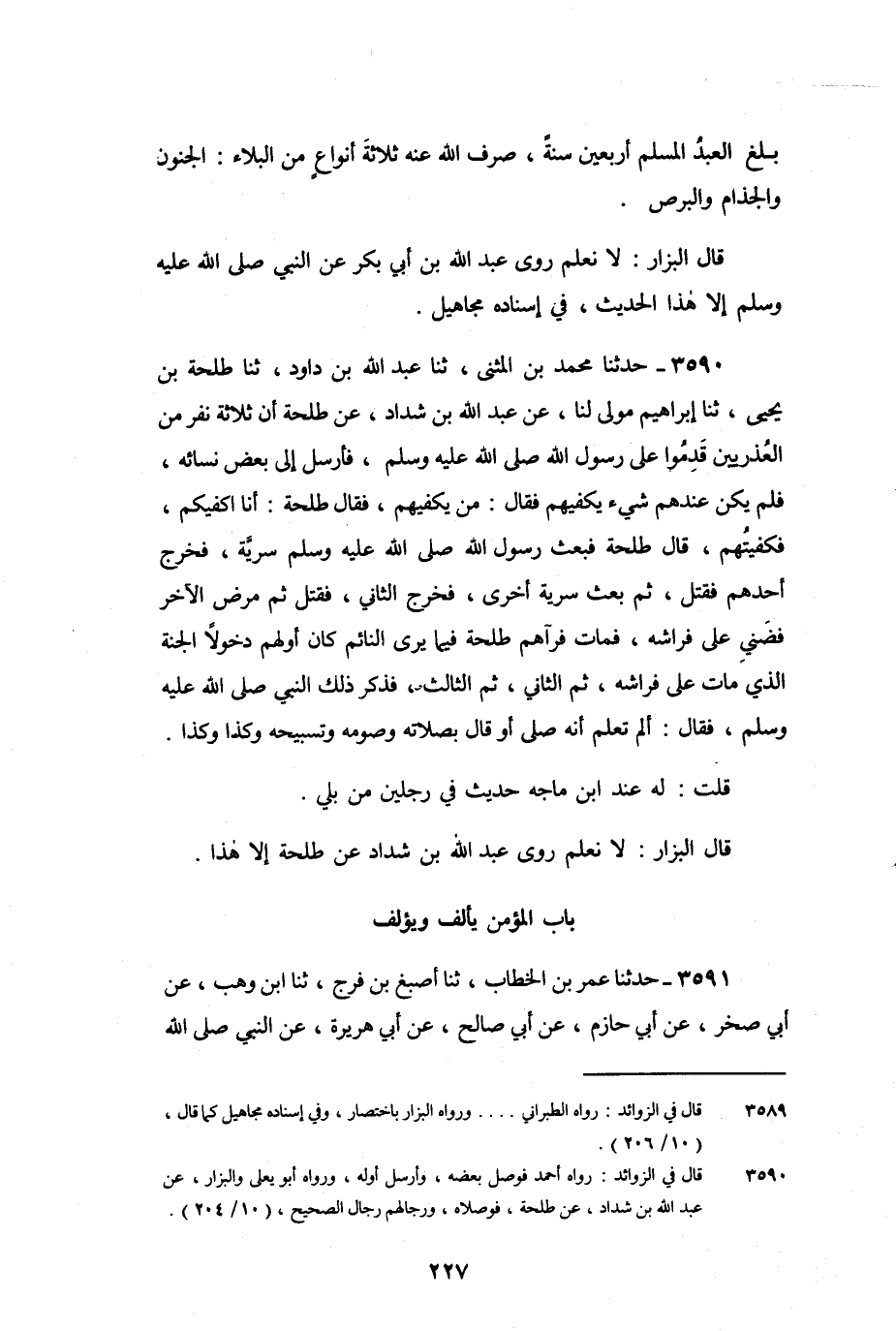 3590 - حَدَّثَنَا مُحَمَّدُ بْنُ الْمُثَنَّى، ثنا عَبْدُ اللَّهِ بْنُ دَاوُدَ، ثنا طَلْحَةُ بْنُ يَحْيَى، ثنا إِبْرَاهِيمُ مَوْلًى لَنَا، عَنْ عَبْدِ اللَّهِ بْنِ شَدَّادٍ، عَنْ طَلْحَةَ، أَنَّ ثَلاثَةَ نَفَرٍ مِنَ الْعُذْرِيِّينَ قَدِمُوا عَلَى رَسُولِ اللَّهِ صَلَّى اللَّهُ عَلَيْهِ وَسَلَّمَ، فَأَرْسَلَ إِلَى بَعْضِ نِسَائِهِ، فَلَمْ يَكُنْ عِنْدَهُمْ شَيْءٌ يَكْفِيهِمْ، فَقَالَ: مَنْ يَكْفِيهِمْ؟ فَقَالَ طَلْحَةُ: أَنَا أَكْفِيكُمْ، فَكَفَيْتُهُمْ، قَالَ طَلْحَةُ: فَبَعَثَ رَسُولُ اللَّهِ صَلَّى اللَّهُ عَلَيْهِ وَسَلَّمَ سَرِيَّةً، فَخَرَجَ أَحَدُهُمْ فَقُتِلَ، ثُمَّ بَعَثَ سَرِيَّةً أُخْرَى، فَخَرَجَ الثَّانِي، فَقُتِلَ، ثُمَّ مَرِضَ الآخَرُ، فَضَنِيَ عَلَى فِرَاشِهِ، فَمَاتَ، فَرَآهُمْ طَلْحَةُ فِيمَا يَرَى النَّائِمُ، كَانَ أَوَّلَهُمْ دُخُولا الْجَنَّةَ الَّذِي مَاتَ عَلَى فِرَاشِهِ، ثُمَّ الثَّانِي، ثُمَّ الثَّالِثُ، فَذَكَرَ ذَلِكَ النَّبِيُّ صَلَّى اللَّهُ عَلَيْهِ وَسَلَّمَ، فَقَالَ: «أَلَمْ تَعْلَمْ أَنَّهُ صَلَّى أَوْ قَالَ بِصَلاتِهِ وَصَوْمِهِ وَتَسْبِيحِهِ وَكَذَا وَكَذَا» .