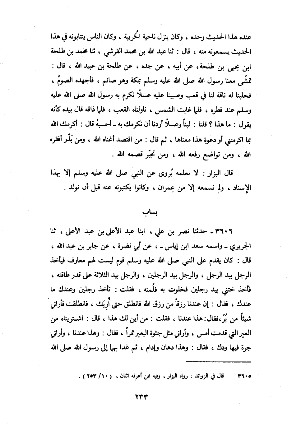 3606 - حَدَّثَنَا نَصْرُ بْنُ عَلِيٍّ، ابنا عَبْدُ الأَعْلَى بْنُ عَبْدِ الأَعْلَى، ثنا الْجُرْيَرِيُّ، وَاسْمُهُ: سَعْدُ بْنُ إِيَاسٍ، عَنْ أَبِي نَضْرَةَ، عَنْ جَابِرِ بْنِ عَبْدِ اللَّهِ، قَالَ: كَانَ يَقْدَمُ عَلَى النَّبِيِّ صَلَّى اللَّهُ عَلَيْهِ وَسَلَّمَ قَوْمٌ لَيْسَتْ لَهُمْ مَعَارِفُ، فَيَأْخُذُ الرَّجُلُ بِيَدِ الرَّجُلِ، وَالرَّجُلُ بِيَدِ الرَّجُلَيْنِ، وَالرَّجُلُ بِيَدِ الثَّلاثَةِ، عَلَى قَدْرِ طَاقَتِهِ، فَأَخَذَ خَتَنِي بِيَدِ رَجُلَيْنِ فَخَلَوْتُ بِهِ، فَلُمْتُهُ، فَقُلْتُ: تَأْخُذُ رَجُلَيْنِ، وَعِنْدَكَ مَا عِنْدَكَ، فَقَالَ: إِنَّ عِنْدَنَا رِزْقًا مِنْ رِزْقِ اللَّهِ، فَانْطَلِقْ حَتَّى أُرِيَكَ، فَانْطَلَقْتُ، فَأَرَانِي شَيْئًا مِنْ بُرٍّ، فَقَالَ: هَذَا عِنْدَنَا، فَقُلْتُ: مِنْ أَيْنَ لَكَ هَذَا، قَالَ: اشْتَرَيْنَاهُ مِنَ الْعِيرِ الَّتِي قَدِمَتْ أَمْسِ، وَأَرَانِي مِثْلَ جَثْوَةِ الْبَعِيرِ تَمْرًا، فَقَالَ: وَهَذَا عِنْدَنَا، وَأَرَانِي جَرَّةً فِيهَا وَدَكٌ، فَقَالَ: وَهَذَا دِهَانٌ وَإِدَامٌ، ثُمَّ غَدَا بِهِمَا إِلَى رَسُولِ اللَّهِ صَلَّى اللَّهُ