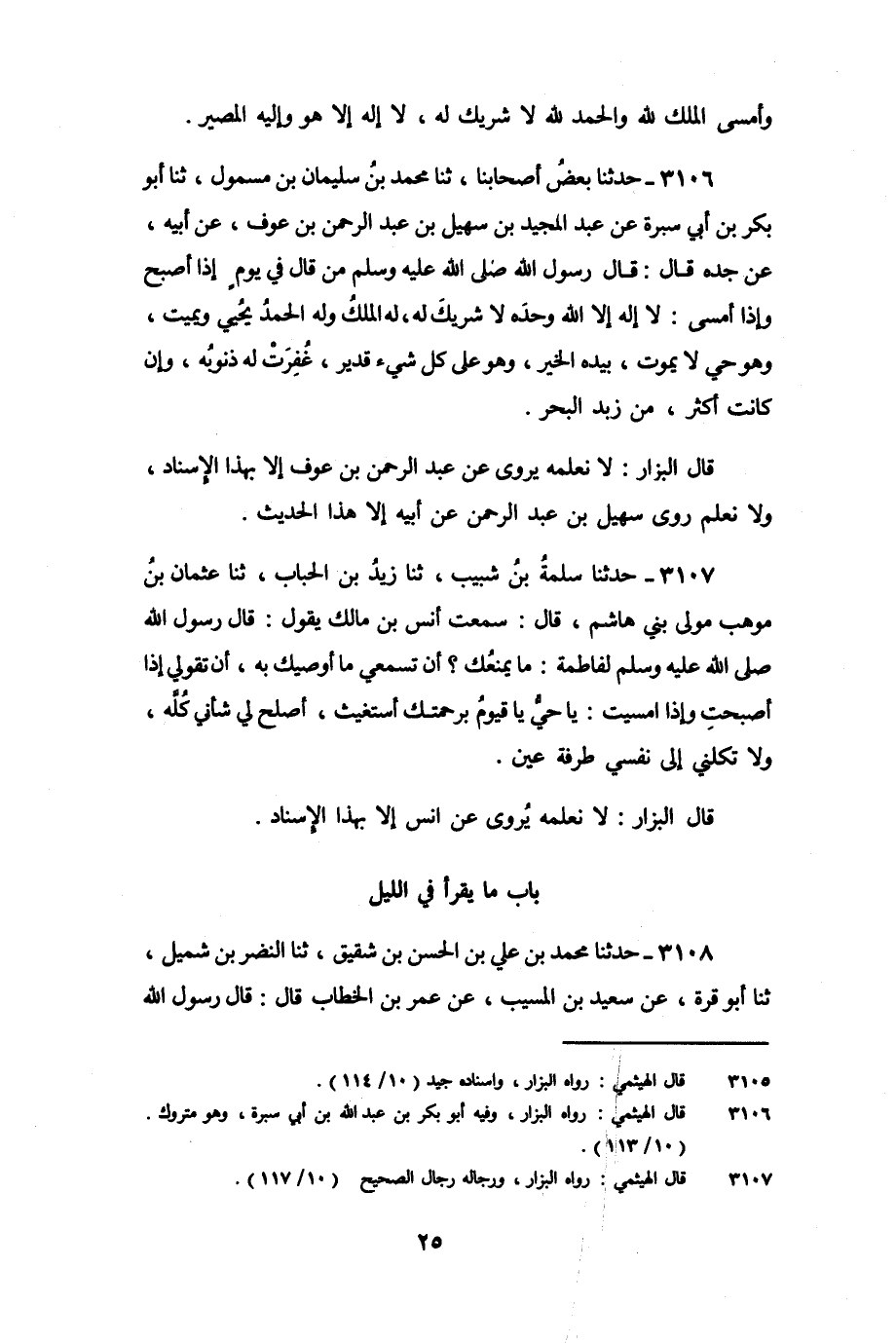 3106 - حَدَّثَنَا بَعْضُ أَصْحَابِنَا، ثنا مُحَمَّدُ بْنُ سُلَيْمَانَ بْنِ مَسْمُولٍ، ثنا أَبُو بَكْرِ بْنُ أَبِي سَبْرَةَ، عَنْ عَبْدِ الْمَجِيدِ بْنِ سُهَيْلِ بْنِ عَبْدِ الرَّحْمَنِ بْنِ عَوْفٍ، عَنْ أَبِيهِ، عَنْ جَدِّهِ، قَالَ: قَالَ رَسُولُ اللَّهِ صَلَّى اللَّهُ عَلَيْهِ وَسَلَّمَ: " مَنْ قَالَ فِي يَوْمٍ إِذَا أَصْبَحَ وَإِذَا أَمْسَى: لا إِلَهَ إِلا اللَّهُ وَحْدَهُ لا شَرِيكَ لَهُ، لَهُ الْمُلْكُ وَلَهُ الْحَمْدُ، يُحْيِي وَيُمِيتُ، وَهُوَ حَيٌّ لا يَمُوتُ، بِيَدِهِ الْخَيْرُ، وَهُوَ عَلَى كُلِّ شَيْءٍ قَدِيرٌ، غَفَرْتُ لَهُ ذُنُوبَهُ، وَإِنْ كَانَتْ أَكْثَرَ مِنْ زَبَدِ الْبَحْرِ ".
