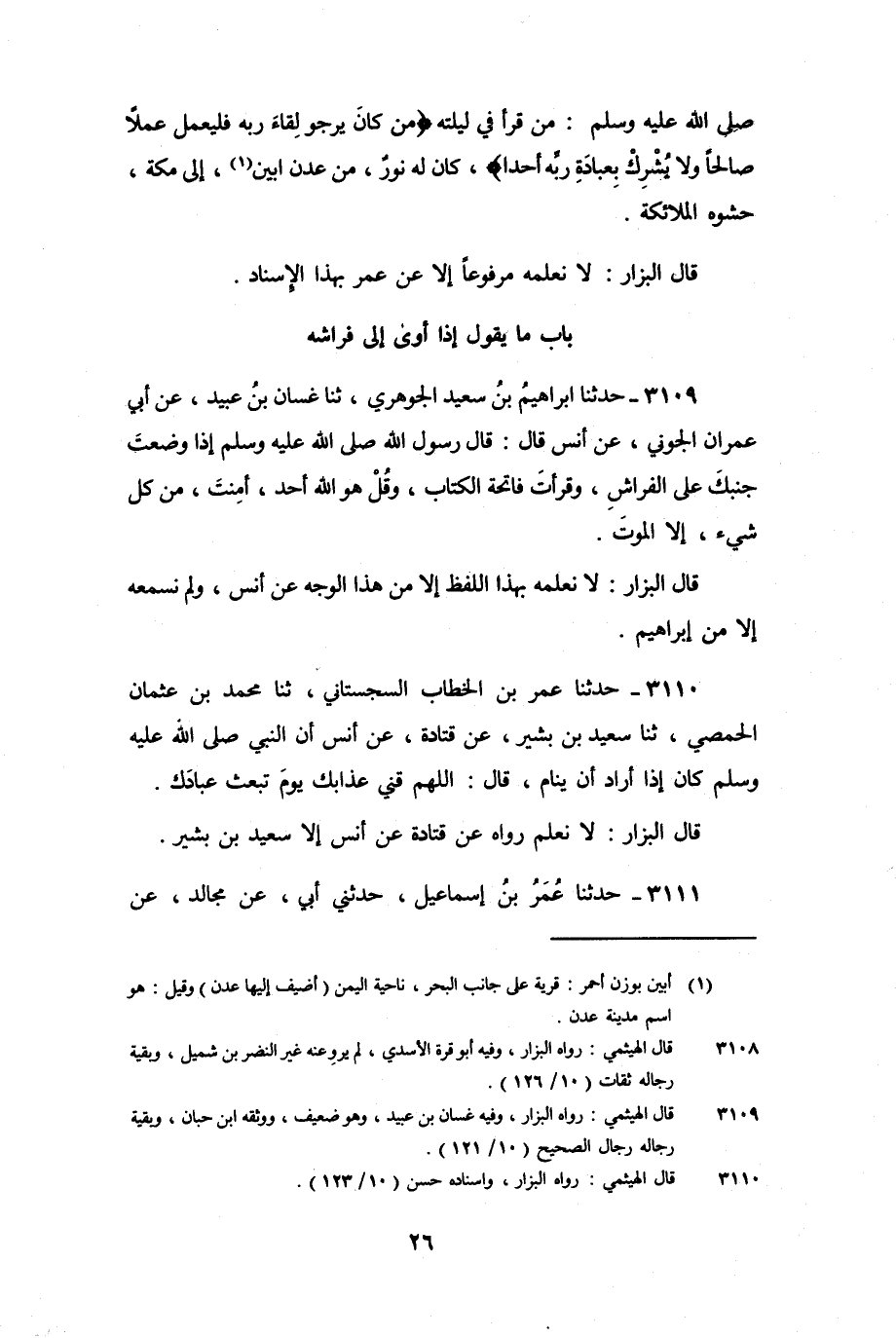 3110 - حَدَّثَنَا عُمَرُ بْنُ الْخَطَّابِ السِّجِسْتَانِيُّ، ثنا مُحَمَّدُ بْنُ عُثْمَانَ الْحِمْصِيُّ، ثنا سَعِيدُ بْنُ بَشِيرٍ، عَنْ قَتَادَةَ، عَنْ أنَسٍ، أَنَّ النَّبِيَّ صَلَّى اللَّهُ عَلَيْهِ وَسَلَّمَ " كَانَ إِذَا أَرَادَ أَنْ يَنَامَ قَالَ: اللَّهُمَّ قِنِي عَذَابَكَ يَوْمَ تَبْعَثُ عِبَادَكَ ".