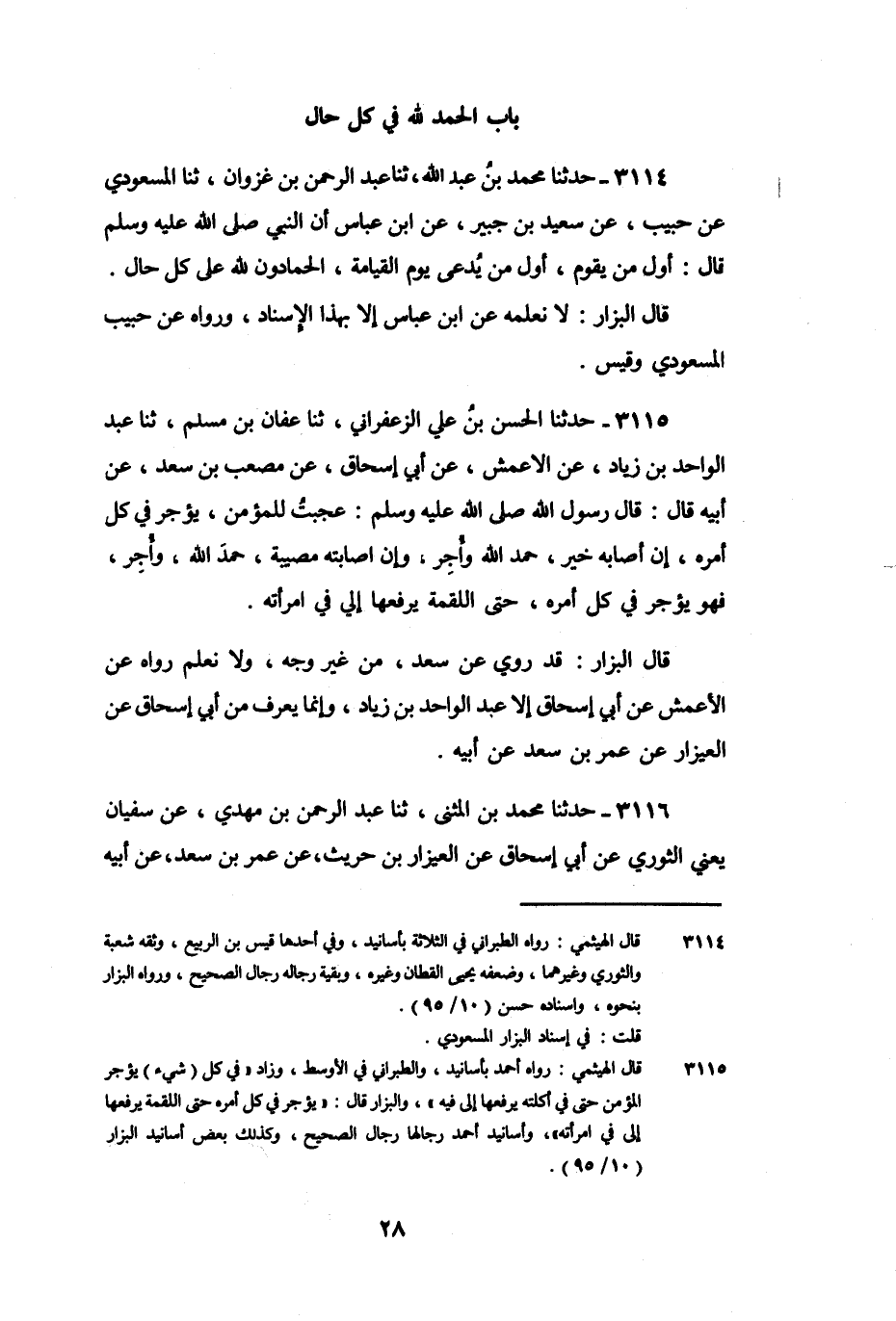 3114 - حَدَّثَنَا مُحَمَّدُ بْنُ عَبْدِ اللَّهِ، ثنا عَبْدُ الرَّحْمَنِ بْنُ غَزْوَانَ، ثنا الْمَسْعُودِيُّ، عَنْ حَبِيبٍ، عَنْ سَعِيدِ بْنِ جُبَيْرٍ، عَنِ ابْنِ عَبَّاسٍ، أَنَّ النَّبِيَّ صَلَّى اللَّهُ عَلَيْهِ وَسَلَّمَ، قَالَ: «أَوَّلُ مَنْ يَقُومُ، أَوَّلُ مَنْ يُدْعَى يَوْمَ الْقِيَامَةِ الْحَمَّادُونَ للَّهِ عَلَى كُلِّ حَالٍ» .