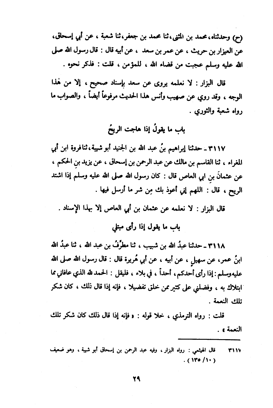3118 - حَدَّثَنَا عَبْدُ اللَّهِ بْنُ شَبِيبٍ، ثنا مُطَرِّفُ بْنُ عَبْدِ اللَّهِ، ثنا عَبْدُ اللَّهِ بْنُ عُمَرَ، عَنْ سُهَيْلٍ، عَنْ أَبِيهِ، عَنْ أَبِي هُرَيْرَةَ، قَالَ: قَالَ رَسُولُ اللَّهِ صَلَّى اللَّهُ عَلَيْهِ وَسَلَّمَ: " إِذَا رَأَى أَحَدُكُمْ أَحَدًا فِي بَلاءٍ، فَلْيَقُلِ: الْحَمْدُ للَّهِ الَّذِي عَافَانِي مِمَّا ابْتَلاكَ بِهِ، وَفَضَّلَنِي عَلَى كَثِيرٍ مِمَّنْ خَلَقَ تَفْضِيلا، فَإِنَّهُ إِذَا قَالَ ذَلِكَ، كَانَ شُكْرَ تِلْكَ النِّعْمَةِ ".