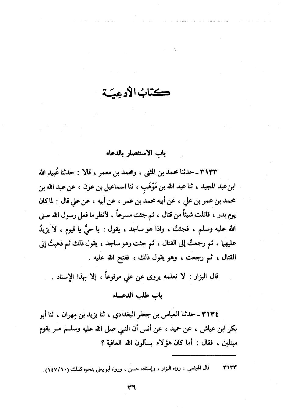3133 - حَدَّثَنَا مُحَمَّدُ بْنُ الْمُثَنَّى، وَمُحَمَّدُ بْنُ مَعْمَرٍ، قَالا: حَدَّثَنَا عُبَيْدُ اللَّهِ بْنُ عَبْدِ الْمَجِيدِ، ثنا عَبْدُ اللَّهِ بْنُ مَوْهَبٍ، ثنا إِسْمَاعِيلُ بْنُ عَوْنٍ، عَنْ عَبْدِ اللَّهِ بْنِ مُحَمَّدِ بْنِ عُمَرَ بْنِ عَلِيٍّ، عَنْ أَبِيهِ مُحَمَّدِ بْنِ عُمَرَ، عَنْ أَبِيهِ، عَنْ عَلِيٍّ، قَالَ: لَمَّا كَانَ يَوْمُ بَدْرٍ، قَاتَلْتُ شَيْئًا مِنْ قِتَالٍ، ثُمَّ جِئْتُ مُسْرِعًا، لأَنْظُرَ مَا فَعَلَ رَسُولُ اللَّهِ صَلَّى اللَّهُ عَلَيْهِ وَسَلَّمَ، فَجِئْتُ، وَإِذَا هُوَ سَاجِدٌ، يَقُولُ: يَا حَيُّ يَا قَيُّومُ، لا يَزِيدُ عَلَيْهِمَا، ثُمَّ رَجَعْتُ إِلَى الْقِتَالِ، ثُمَّ جِئْتُ وَهُوَ سَاجِدٌ، يَقُولُ ذَلِكَ، ثُمَّ ذَهَبْتُ إِلَى الْقِتَالِ، ثُمَّ رَجَعْتُ، وَهُوَ يَقُولُ ذَلِكَ، فَفَتَحَ اللَّهُ عَلَيْهِ.
