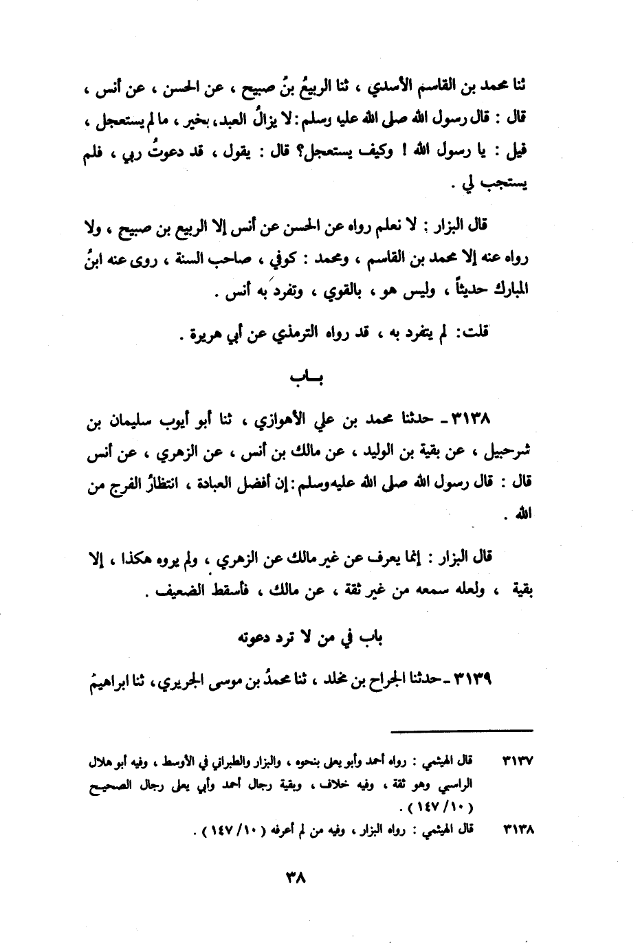 ثنا مُحَمَّدُ بْنُ الْقَاسِمِ الأَسَدِيُّ، ثنا الرَّبِيعُ بْنُ صُبَيْحٍ، عَنِ الْحَسَنِ، عَنْ أنَسٍ، قَالَ: قَالَ رَسُولُ اللَّهِ صَلَّى اللَّهُ عَلَيْهِ وَسَلَّمَ: " لا يَزَالُ الْعَبْدُ بِخَيْرٍ مَا لَمْ يَسْتَعْجِلْ، قِيلَ: يَا رَسُولَ اللَّهِ! وَكَيْفَ يَسْتَعْجِلُ؟ قَالَ: يَقُولُ: قَدْ دَعَوْتُ رَبِّي، فَلَمْ يَسْتَجِبْ لِي ".