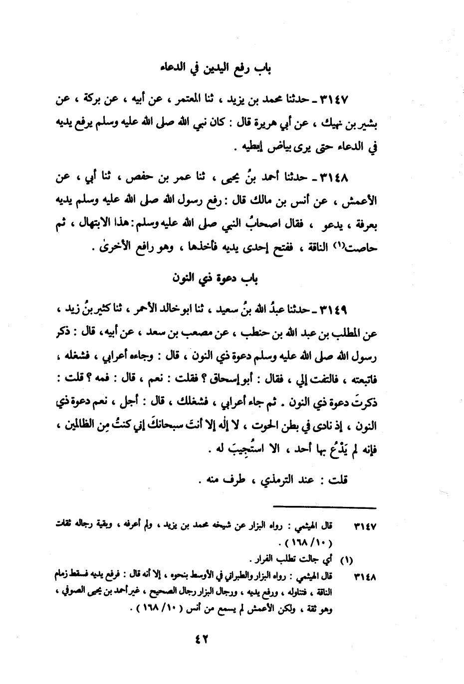 3147 - حَدَّثَنَا مُحَمَّدُ بْنُ يَزِيدَ، ثنا الْمُعْتَمِرُ، عَنْ أَبِيهِ، عَنْ بَرَكَةَ، عَنْ بَشِيرِ بْنِ نَهِيكٍ، عَنْ أَبِي هُرَيْرَةَ، قَالَ: «كَانَ نَبِيُّ اللَّهِ صَلَّى اللَّهُ عَلَيْهِ وَسَلَّمَ يَرْفَعُ يَدَيْهِ فِي الدُّعَاءِ حَتَّى يُرَى بَيَاضُ إِبْطَيْهِ»