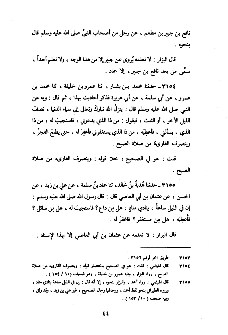 3155 - حَدَّثَنَا هُدْبَةُ بْنُ خَالِدٍ، ثنا حَمَّادُ بْنُ سَلَمَةَ، عَنْ عَلِيِّ بْنِ زَيْدٍ، عَنِ الْحَسَنِ، عَنْ عُثْمَانَ بْنِ أَبِي الْعَاصِي، قَالَ: قَالَ رَسُولُ اللَّهِ صَلَّى اللَّهُ عَلَيْهِ وَسَلَّمَ: " إِنَّ فِي اللَّيْلِ سَاعَةً يُنَادِي مُنَادٍ: هَلْ مِنْ دَاعٍ فَأَسْتَجِيبَ لَهُ؟ هَلْ مِنْ سَائِلٍ فَأُعْطِيَهُ؟ هَلْ مِنْ مُسْتَغْفِرٍ فَأَغْفِرَ لَهُ؟ ".