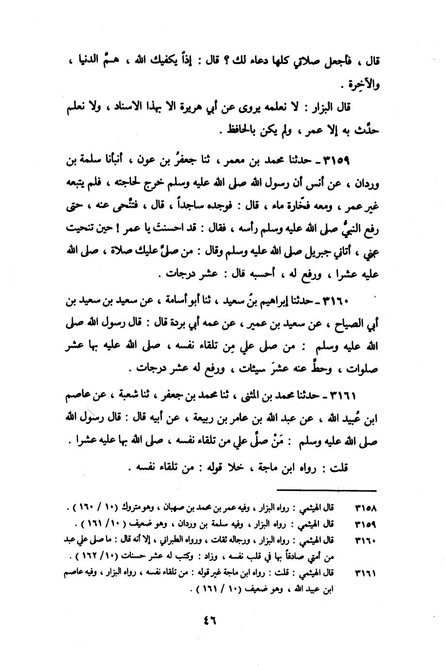 3159 - حَدَّثَنَا مُحَمَّدُ بْنُ مَعْمَرٍ، ثنا جَعْفَرُ بْنُ عَوْنٍ، أَنْبَأَنَا سَلَمَةُ بْنُ وَرْدَانَ، عَنْ أنَسٍ، أَنَّ رَسُولَ اللَّهِ صَلَّى اللَّهُ عَلَيْهِ وَسَلَّمَ خَرَجَ لِحَاجَتِهِ، فَلَمْ يَتْبَعْهُ غَيْرُ عُمَرَ، وَمَعَهُ فَخَّارَةُ مَاءٍ، قَالَ: فَوَجَدَهُ سَاجِدًا، قَالَ: فَتَنَحَّى عَنْهُ، حَتَّى رَفَعَ النَّبِيُّ صَلَّى اللَّهُ عَلَيْهِ وَسَلَّمَ رَأْسَهُ، فَقَالَ: قَدْ أَحْسَنْتَ يَا عُمَرُ! حِينَ تَنَحَّيْتَ عَنِّي، أَتَانِي جِبْرِيلُ صَلَّى اللَّهُ عَلَيْهِ وَسَلَّمَ، وَقَالَ: مَنْ صَلَّى عَلَيْكَ صَلاةً صَلَّى اللَّهُ عَلَيْهِ عَشْرًا، وَرَفَعَ لَهُ، أَحْسِبُهُ قَالَ: عَشْرَ دَرَجَاتٍ "