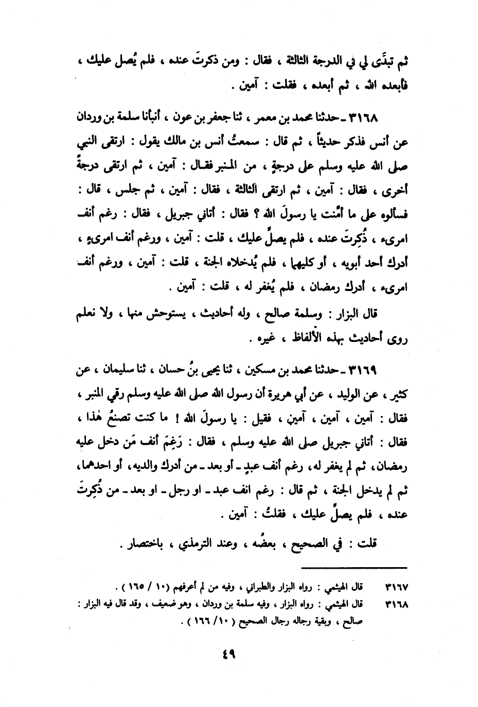 3169 - حَدَّثَنَا مُحَمَّدُ بْنُ مِسْكِينٍ، ثنا يَحْيَى بْنُ حَسَّانٍ، ثنا سُلَيْمَانُ، عَنْ كَثِيرٍ، عَنِ الْوَلِيدِ، عَنْ أَبِي هُرَيْرَةَ، أَنَّ رَسُولَ اللَّهِ صَلَّى اللَّهُ عَلَيْهِ وَسَلَّمَ رَقِيَ الْمِنْبَرَ، فَقَالَ: آمِينَ، آمِينَ، آمِينَ، فَقِيلَ: يَا رَسُولَ اللَّهِ! مَا كُنْتَ تَصْنَعُ هَذَا، فَقَالَ: أَتَانِي جِبْرِيلُ صَلَّى اللَّهُ عَلَيْهِ وَسَلَّمَ، فَقَالَ: رَغِمَ أَنْفُ مَنْ دَخَلَ عَلَيْهِ رَمَضَانُ، ثُمَّ لَمْ يُغْفَرْ لَهُ، رَغِمَ أَنْفُ عَبْدٍ، أَوْ بَعُدَ، مَنْ أَدْرَكَ وَالِدَيْهِ، أَوْ أَحَدَهُمَا، ثُمَّ لَمْ يَدْخُلِ الْجَنَّةَ، ثُمَّ قَالَ: رَغِمَ أَنْفُ عَبْدٍ، أَوْ رَجُلٍ، أَوْ بَعُدَ، مَنْ ذُكِرْتَ عِنْدَهُ، فَلَمْ يُصَلِّ عَلَيْكَ، فَقُلْتُ: آمِينَ ".