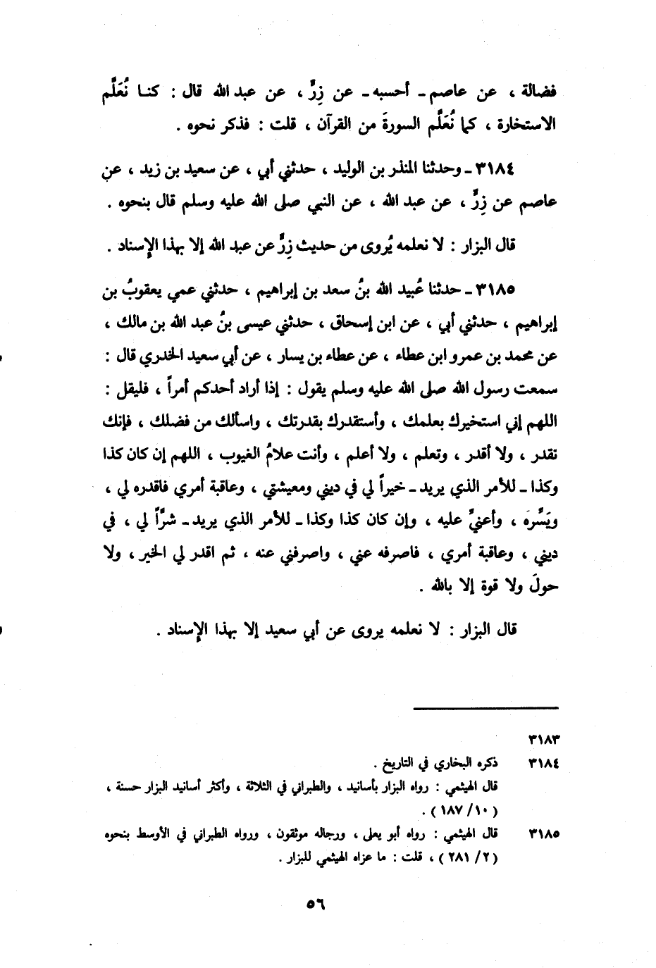 فَضَالَةَ، عَنْ عَاصِمٍ، أَحْسِبُهُ، عَنْ زِرٍّ، عَنْ عَبْدِ اللَّهِ، قَالَ: كُنَّا نُعَلَّمُ الاسْتِخَارَةَ، كَمَا نُعَلَّمُ السُّورَةَ مِنَ الْقُرْآنِ، قُلْتُ: فَذَكَرَ نَحْوَهُ.