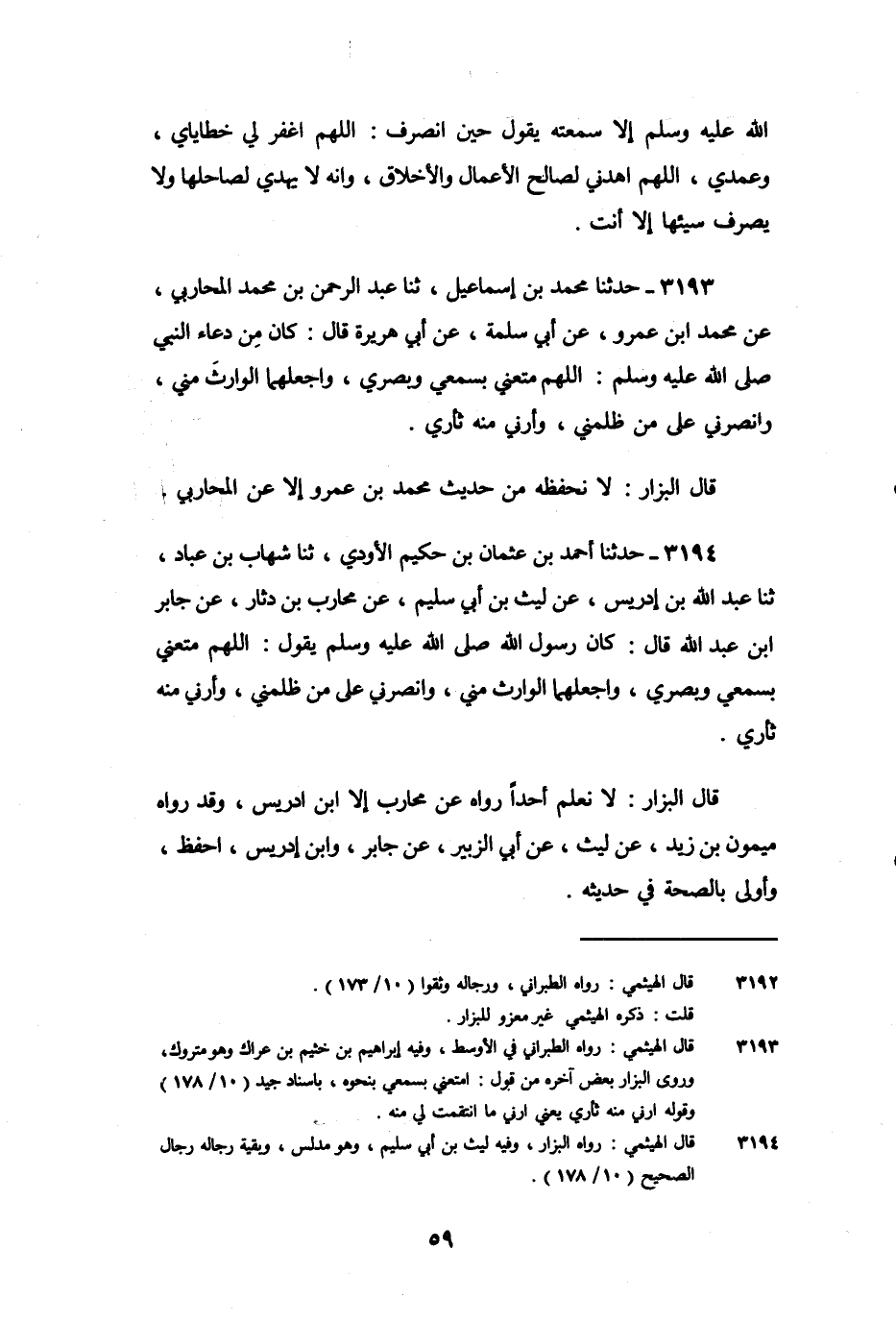3194 - حَدَّثَنَا أَحْمَدُ بْنُ عُثْمَان بْنِ حَكِيمٍ الأَوْدِيُّ، ثنا شِهَابُ بْنُ عَبَّادٍ، ثنا عَبْدُ اللَّهِ بْنُ إِدْرِيسَ، عَنْ لَيْثِ بْنِ أَبِي سُلَيْمٍ، عَنْ مُحَارِبِ بْنِ دِثَارٍ، عَنْ جَابِرِ بْنِ عَبْدِ اللَّهِ، قَالَ: كَانَ رَسُولُ اللَّهِ صَلَّى اللَّهُ عَلَيْهِ وَسَلَّمَ، يَقُولُ: «اللَّهُمَّ مَتِّعْنِي بِسَمْعِي وَبَصَرِي، وَاجْعَلْهُمَا الْوَارِثَ مِنِّي، وَانْصُرْنِي عَلَى مَنْ ظَلَمَنِي، وَأَرِنِي مِنْهُ ثَأْرِي» .