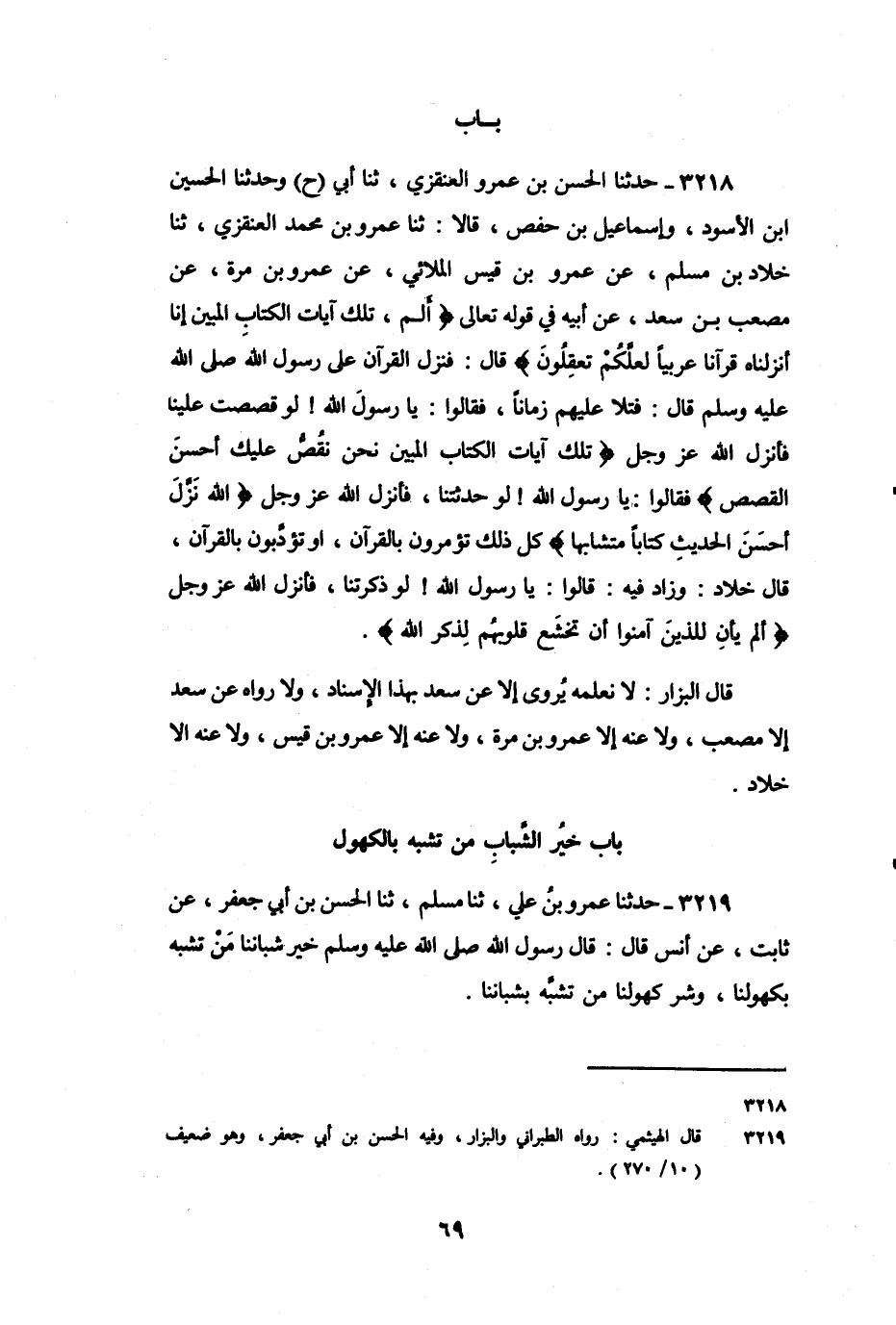 3218 - حَدَّثَنَا الْحَسَنُ بْنُ عَمْرٍو الْعَنْقَزِيُّ، ثنا أَبِي (ح) وَحَدَّثَنَا الْحُسَيْنُ بْنُ الأَسْوَدِ، وَإِسْمَاعِيلُ بْنُ حَفْصٍ، قَالا: ثنا عَمْرُو بْنُ مُحَمَّدٍ الْعَنْقَزِيُّ، ثنا خَلادُ بْنُ مُسْلِمٍ، عَنْ عَمْرِو بْنِ قَيْسٍ الْمُلائِيِّ، عَنْ عَمْرِو بْنِ مُرَّةَ، عَنْ مُصْعَبِ بْنِ سَعْدٍ، عَنِ أَبِيهِ، فِي قَوْلِهِ تَعَالَى: {الر تِلْكَ آيَاتُ الْكِتَابِ الْمُبِينِ {1} إِنَّا أَنْزَلْنَاهُ قُرْءَانًا عَرَبِيًّا لَعَلَّكُمْ تَعْقِلُونَ {2} } [يوسف: 1-2] قَالَ: فَنَزَلَ الْقُرْآنُ عَلَى رَسُولِ اللَّهِ صَلَّى اللَّهُ عَلَيْهِ وَسَلَّمَ، قَالَ: فَتَلا عَلَيْهِمْ زَمَانًا، فَقَالُوا: يَا رَسُولَ اللَّهِ! لَوْ قَصَصْتَ عَلَيْنَا، فَأَنْزَلَ اللَّهُ عَزَّ وَجَلَّ: {نَحْنُ نَقُصُّ عَلَيْكَ أَحْسَنَ الْقَصَصِ} [يوسف: 3] فَقَالُوا: يَا رَسُولَ اللَّهِ! لَوْ حَدَّثْتَنَا، فَأَنْزَلَ اللَّهُ عَزَّ وَجَلَّ {اللَّهُ نَزَّلَ أَحْسَنَ الْحَدِيثِ كِتَابًا مُتَشَابِهًا} [الزمر: 23] كُلُّ ذَلِكَ تُؤْمَرُونَ بِالْقُرْآنِ، أَوْ تُؤَدَّبُونَ بِالْقُرْآنِ، قَالَ خَلادٌ: وَزَادَ فِيهِ: قَالُوا: يَا رَسُولَ اللَّهِ! لَوْ ذَكَّرْتَنَا، فَأَنْزَلَ اللَّهُ عَزَّ وَجَلَّ {أَلَمْ يَأْنِ لِلَّذِينَ آمَنُوا أَنْ تَخْشَعَ قُلُوبُهُمْ لِذِكْرِ اللَّهِ} [الحديد: 16] ".