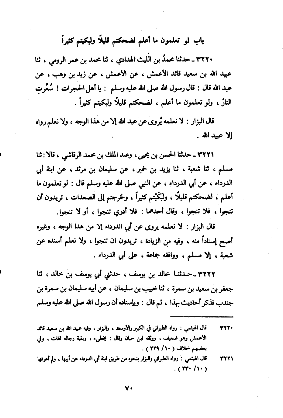 3220 - حَدَّثَنَا مُحَمَّدُ بْنُ اللَّيْثِ الْهَدَادِيُّ، ثنا مُحَمَّدُ بْنُ عُمَرَ الرُّومِيُّ، ثنا عُبَيْدُ اللَّهِ بْنُ سَعِيدٍ قَائِدُ الأَعْمَشِ، عَنِ الأَعْمَشِ، عَنْ زَيْدِ بْنِ وَهْبٍ، عَنْ عَبْدِ اللَّهِ، قَالَ رَسُولُ اللَّهِ صَلَّى اللَّهُ عَلَيْهِ وَسَلَّمَ: " يَا أَهْلَ الْحُجُرَاتِ! سُعِّرَتِ النَّارُ، وَلَوْ تَعْلَمُونَ مَا أَعْلَمُ، لَضَحِكْتُمْ قَلِيلا وَلَبَكَيْتُمْ كَثِيرًا.
