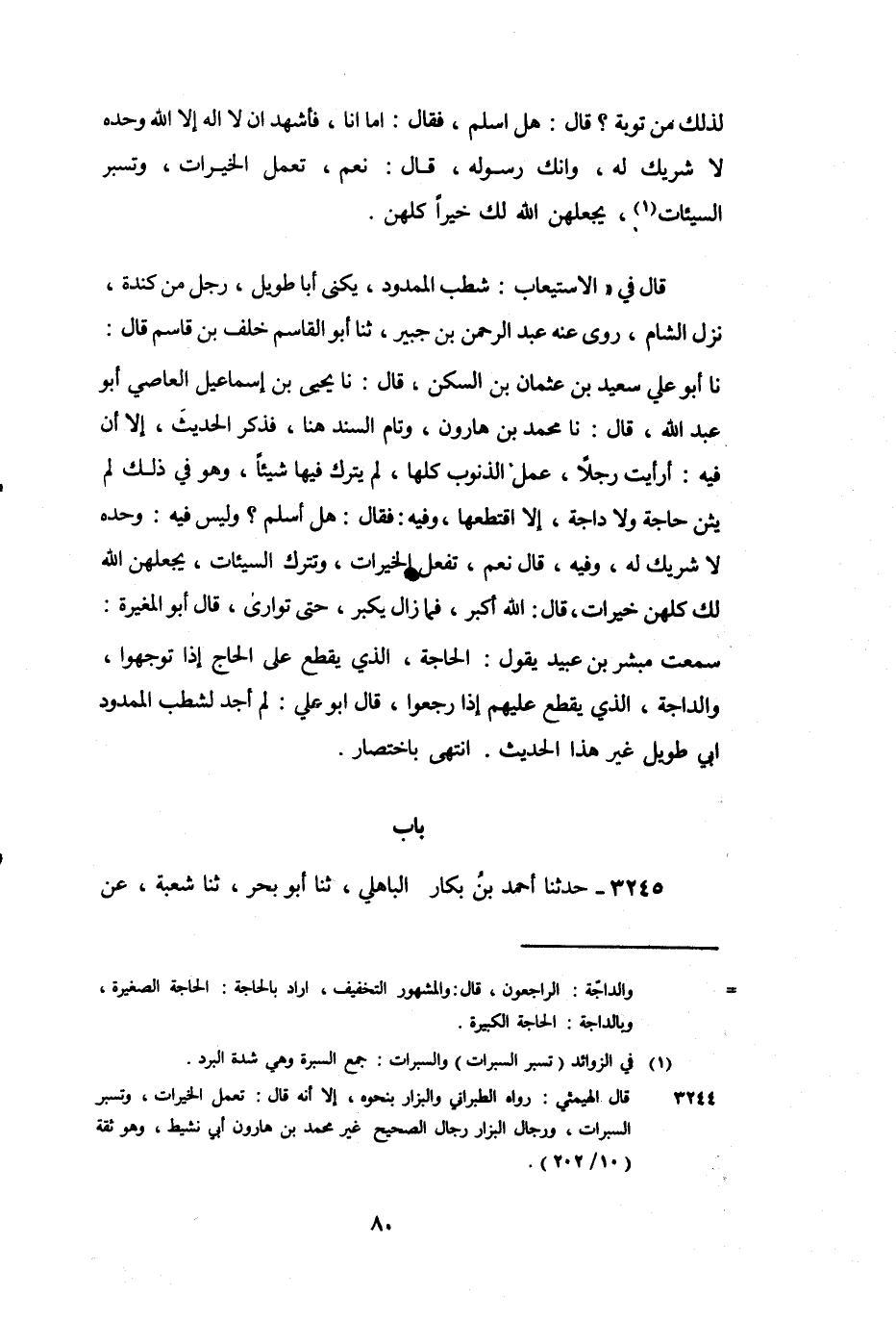 قَالَ فِي (الاسْتِيعَابِ) : شطبٌ الْمَمْدُودُ، يُكَنَّى أَبَا طَوِيلٍ، رَجُلٌ مِنْ كِنْدَةَ، نَزَلَ الشَّامَ، رَوَى عَنْهُ عَبْدُ الرَّحْمَنِ بْنُ جُبَيْرٍ، ثنا أَبُو الْقَاسِمِ خَلَفُ بْنُ قَاسِمٍ، قَالَ: نا أَبُو عَلِيٍّ سَعِيدُ بْنُ عُثْمَانَ بْنِ السَّكَنِ، قَالَ: نا يَحْيَى بْنُ إِسْمَاعِيلَ الْعَاصِي أَبُو عَبْدِ اللَّهِ، قَالَ: نا مُحَمَّدُ بْنُ هَارُونَ، وَتَامَّ السَّنَدَ هُنَا، فَذَكَرَ الْحَدِيثَ، إِلا أَنَّ فِيهِ: أَرَأَيْتَ رَجُلا عَمِلَ الذُّنُوبَ كُلَّهَا، لَمْ يَتْرُكْ فِيهَا شَيْئًا، وَهُوَ فِي ذَلِكَ لَمْ يُثْنِ حَاجَّةً وَلا دَاجَّةً، إِلا اقْتَطَعَهَا، وَفِيهِ: فَقَالَ: هَلْ أَسْلَمَ؟ وَلَيْسَ فِيهِ: وَحْدَهُ لا شَرِيكَ لَهُ، وَفِيهِ: قَالَ: نَعَمْ، تَفْعَلِ الْخَيْرَاتِ، وَتَتْرُكِ السَّيِّئَاتِ، يَجْعَلْهُنَّ اللَّهُ لَكَ كُلَّهُنَّ خَيْرَاتٍ، قَالَ: اللَّهُ أَكْبَرُ، فَمَا زَالَ يُكَبِّرُ، حَتَّى تَوَارَى، قَالَ أَبُو الْمُغِيرَةِ: سَمِعْتُ مُبَشِّرَ بْنَ عُبَيْدٍ يَقُولُ: الْحَاجَّةُ، الَّذِي يَقْطَعُ عَلَى الْحَاجِّ إِذَا تَوَجَّهُوا، وَالدَّاجَّةُ، الَّذِي يَقْطَعُ عَلَيْهِمْ إِذَا رَجَعُوا، قَالَ أَبُو عَلِيٍّ: لَمْ أَجِدْ لِشطبٍ الْمَمْدُودِ أَبِي طَوِيلٍ غَيْرَ هَذَا الْحَدِيثِ.