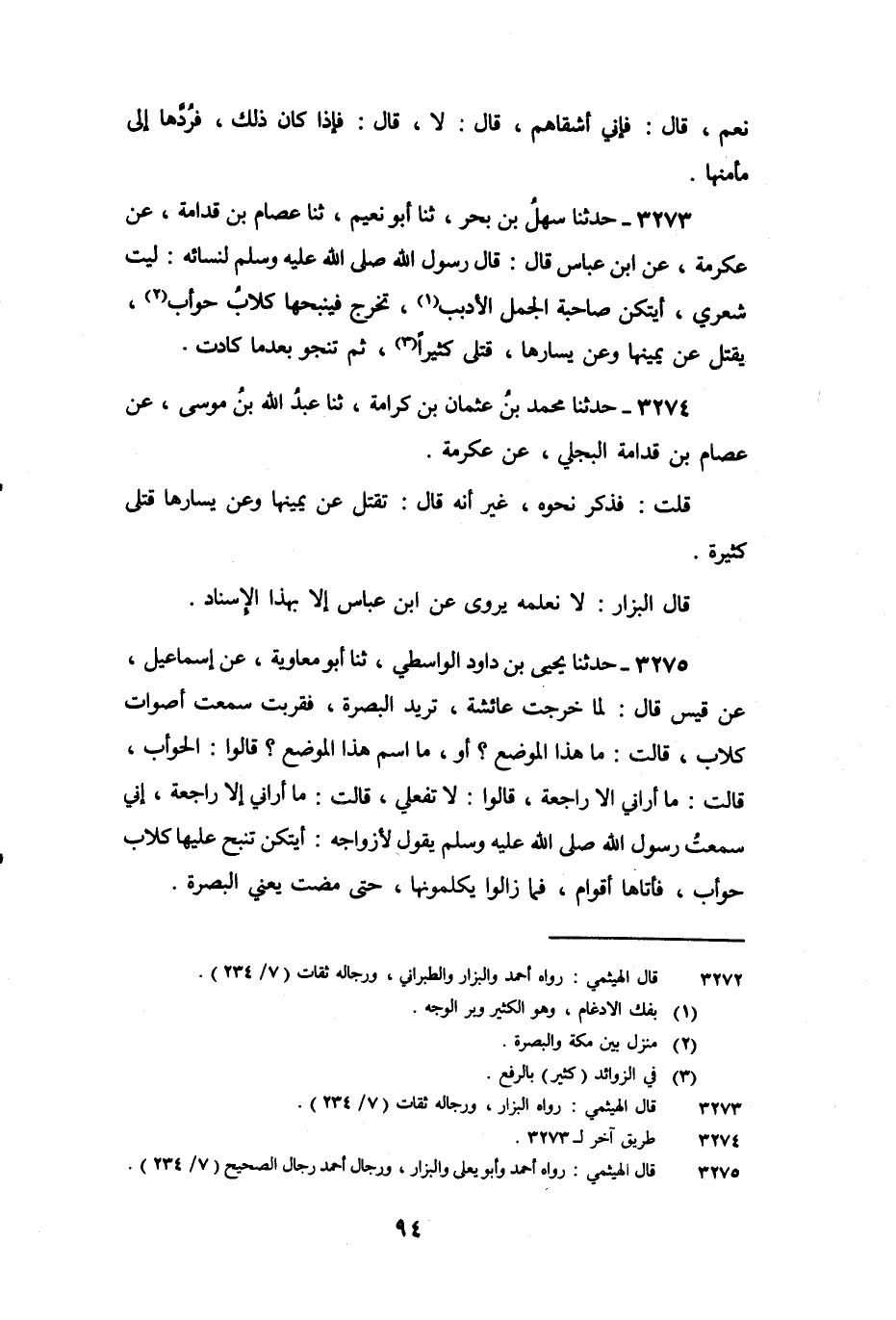3275 - حَدَّثَنَا يَحْيَى بْنُ دَاوُدَ الْوَاسِطِيُّ، ثنا أَبُو مُعَاوِيَةَ، عَنْ إِسْمَاعِيلَ، عَنْ قَيْسٍ، قَالَ: لَمَّا خَرَجَتْ عَائِشَةُ تُرِيدُ الْبَصْرَةَ، فَقَرُبَتْ سَمِعَتْ أَصْوَاتَ كِلابٍ، قَالَتْ: مَا هَذَا الْمَوْضِعُ؟ ، أَوْ: مَا اسْمُ هَذَا الْمَوْضِعِ؟ قَالُوا: الْحَوْأَبُ، قَالَتْ: مَا أَرَانِي إِلا رَاجِعَةً، قَالُوا: لا تَفْعَلِي، قَالَتْ: مَا أَرَانِي إِلا رَاجِعَةً، إِنِّي سَمِعْتُ رَسُولَ اللَّهِ صَلَّى اللَّهُ عَلَيْهِ وَسَلَّمَ يَقُولُ لأَزْوَاجِهِ: «أَيَّتُكُنَّ تَنْبَحُ عَلَيْهَا كِلابُ حَوْأَبٍ؟» ، فَأَتَاهَا أَقْوَامٌ، فَمَا زَالُوا يُكَلِّمُونَهَا، حَتَّى مَضَتْ، يَعْنِي: الْبَصْرَةَ