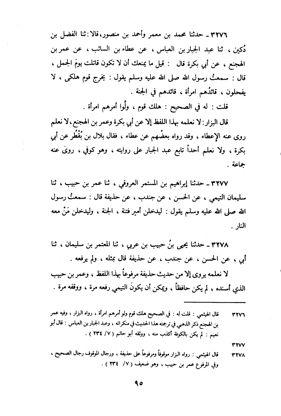 3276 - حَدَّثَنَا مُحَمَّدُ بْنُ مَعْمَرٍ وَأَحْمَدُ بْنُ مَنْصُورٍ، قَالا: ثنا الْفَضْلُ بْنُ دُكَيْنٍ، ثنا عَبْدُ الْجَبَّارِ بْنُ الْعَبَّاسِ، عَنْ عَطَاءِ بْنِ السَّائِبِ، عَنْ عُمَرَ بْنِ الْهَجَنَّعِ، عَنْ أَبِي بَكْرَةَ، قَالَ: قِيلَ: مَا يَمْنَعُكَ أَنْ لا تَكُونَ قَاتَلْتَ يَوْمَ الْجَمَلِ، قَالَ: سَمِعْتُ رَسُولَ اللَّهِ صَلَّى اللَّهُ عَلَيْهِ وَسَلَّمَ يَقُولُ: «يَخْرُجُ قَوْمٌ هَلْكَى، لا يُفْلِحُونَ، قَائِدُهُمُ امْرَأَةٌ، قَائِدُهُمْ فِي الْجَنَّةِ» .