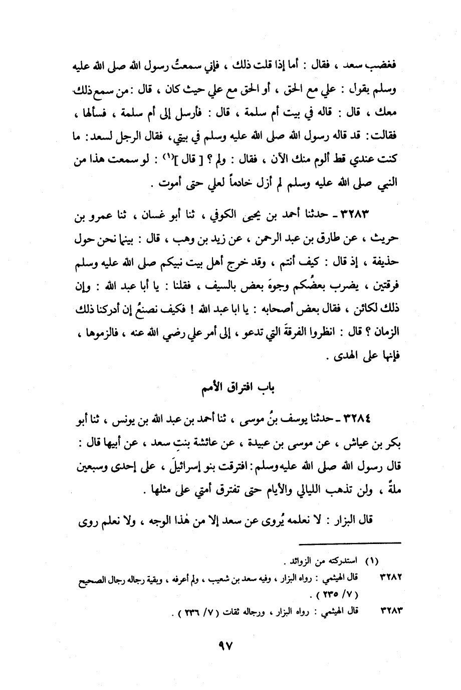 3284 - حَدَّثَنَا يُوسُفُ بْنُ مُوسَى، ثنا أَحْمَدُ بْنُ عَبْدِ اللَّهِ بْنِ يُونُسَ، ثنا أَبُو بَكْرِ بْنُ عَيَّاشٍ، عَنْ مُوسَى بْنِ عُبَيْدَةَ، عَنْ عَائِشَةَ بِنْتِ سَعْدٍ، عَنْ أَبِيهَا، قَالَ: قَالَ رَسُولُ اللَّهِ صَلَّى اللَّهُ عَلَيْهِ وَسَلَّمَ: «افْتَرَقَتْ بَنُو إِسْرَائِيلَ عَلَى إِحْدَى وَسَبْعِينَ مِلَّةً، وَلَنْ تَذْهَبَ اللَّيَالِي وَالأَيَّامُ حَتَّى تَفْتَرِقَ أُمَّتِي عَلَى مِثْلِهَا» .