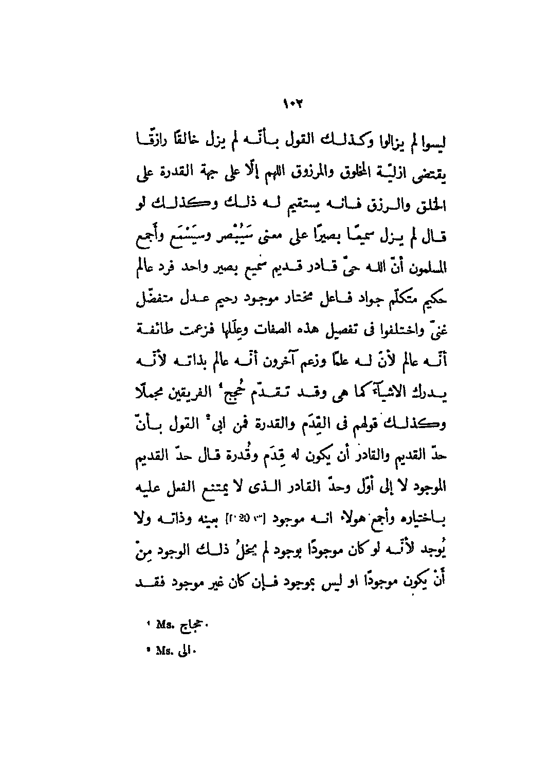 ليسوا لم يزالوا وكذلك القول بأنه لم يزل خالقاً رازقاً يقتضي أزلية المخلوق والمرزوق اللَّهمّ إلا على جهة القدرة على الخلق والرزق فإنه يستقيم له ذلك وكذلك لو قال لم يزل سميعاً بصيراً على معنى سيبصر وسيسمع وأجمع المسلمون أن الله حي قادر قديم سميع بصير واحد فرد عالم حكيم متكلم جواد فاعل مختار موجود رحيم عدل متفضل غني واختلفوا في تفصيل هذه الصفات وعللها فزعمت طائفة أنه عالم لأن له علماً وزعم آخرون أنه عالم بذاته لأنه يدرك الأشياء كما هي وقد تقدم حجج [1] الفريقين مجملاً وكذلك قولهم في القدم والقدرة فمن أبى [2] القول بأن حد القديم والقادر أن يكون له قدم وقدرة قال حد القديم الموجود لا إلى أول وحد القادر الذي لا يمتنع الفعل عليه باختياره وأجمع هؤلاء أنه موجود [20] بعينه وذاته ولا يوجد لأنه لو كان موجوداً بوجود لم يخل ذلك الوجود من أن يكون موجوداً أو ليس بموجود فإن كان غير موجود فقد