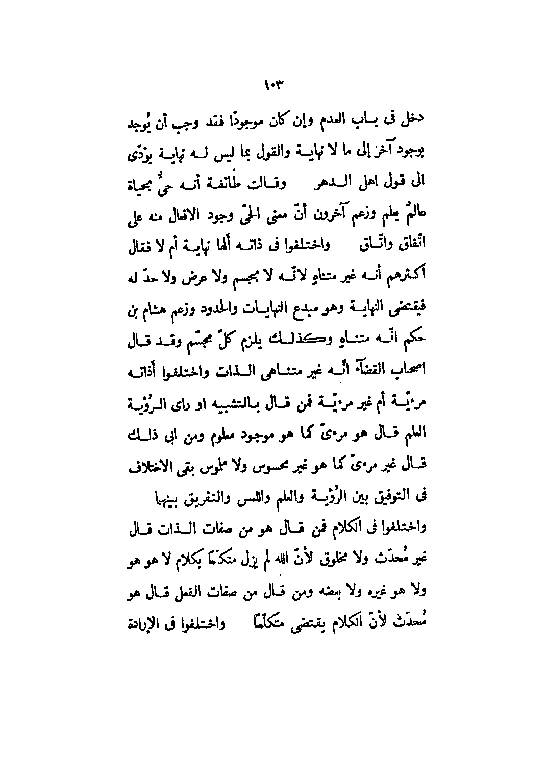 دخل في باب العدم وإن كان موجوداً فقد وجب أن يوجد بوجود آخر إلى ما لا نهاية والقول بما ليس له نهاية يؤدي الى قول أهل الدهر وقالت طائفة أنه حي بحياة عالم بعلم وزعم آخرون أن معنى الحي وجود الأفعال منه على اتفاق واتساق واختلفوا في ذاته ألها نهاية أم لا فقال أكثرهم أنه غير متناه لأنه لا بجسم ولا عرض ولا حد له فيقتضي النهاية وهو مبدع النهايات والحدود وزعم هشام بن حكم أنه متناه وكذلك يلزم كل مجسم وقد قال أصحاب القضاء أنه غير متناهي الذات واختلفوا أذاته مرئيّة أم غير مرئيّة فمن قال بالتشبيه أو رأى الرؤية العلم قال هو مرئيّ كما هو موجود معلوم ومن أبى ذلك قال غير مرئيّ كما هو غير محسوس ولا ملموس بقى الاختلاف في التوفيق بين الرؤية والعلم واللمس والتفريق بينهما واختلفوا في الكلام فمن قال هو من صفات الذات قال غير محدث ولا مخلوق لأن الله لم يزل متكلما بكلام لا هو هو ولا هو غيره ولا بعضه ومن قال من صفات الفعل قال هو محدث لأن الكلام يقتضي متكلماً واختلفوا في الإرادة