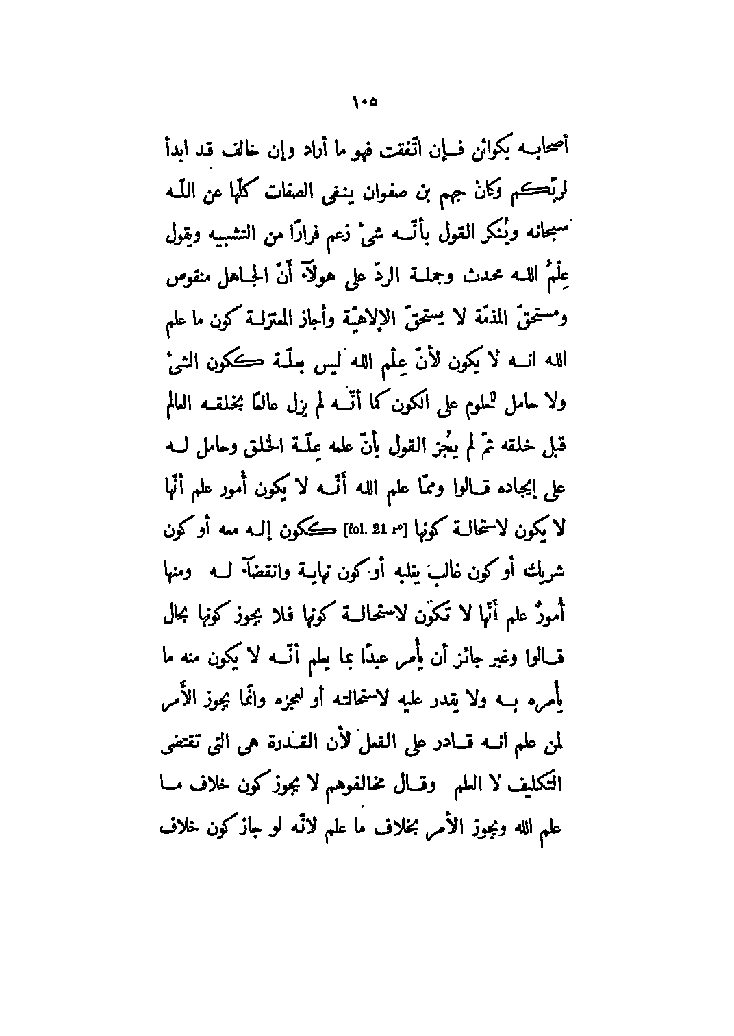 أصحابه بكوائن فإن اتفقت فهو ما أراد وإن خالف قد ابدأ لربكم وكان جهم بن صفوان ينفى الصفات كلها عن الله سبحانه وينكر القول بأنه شيء زعم فراراً من التشبيه ويقول علم الله محدث وجملة الرد على هؤلاء أن الجاهل منقوص ومستحق المذمة لا يستحق الإلهيّة وأجاز المعتزلة كون ما علم الله أنه لا يكون لأن علم الله ليس بعلة ككون الشيء ولا حامل للمعلوم على الكون كما أنه لم يزل عالماً بخلقه العالم قبل خلقه ثم لم يجز القول بأن علمه علة الخلق وحامل له على إيجاده قالوا ومما علم الله أنه لا يكون أمور علم أنها لا يكون لاستحالة كونها [fol 21] ككون إله معه أو كون شريك أو كون غالب يغلبه أو كون نهاية وانقضاء له ومنها أمور علم أنها لا تكون لاستحالة كونها فلا يجوز كونها بحال قالوا وغير جائز أن يأمر عبداً بما يعلم أنه لا يكون منه ما يأمره به ولا يقدر عليه لاستحالته أو لعجزه وإنما يجوز الأمر لمن علم أنه قادر على الفعل لأن القدرة هي التي تقتضي التكليف لا العلم وقال مخالفوهم لا يجوز كون خلاف ما علم الله ويجوز الأمر بخلاف ما علم لأنه لو جاز كون خلاف