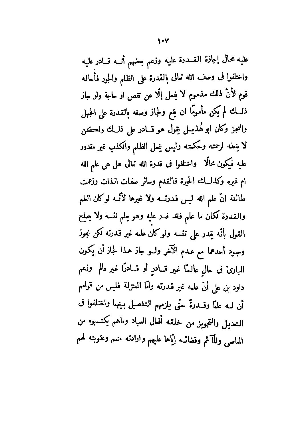 عليه محال إجازة القدرة عليه وزعم بعضهم أنه قادر عليه واختلفوا في وصف الله تعالى بالقدرة على الظلم والجور فأحاله قوم لأن ذلك مذموم لا يفعل إلا عن نقص أو حاجة ولو جاز ذلك لم يكن مأموماً أن يقع ولجاز وصفه بالقدرة على الجهل والعجز وكان أبو هذيل يقول هو قادر على ذلك ولكن لا يفعله لرحمته وحكمته وليس يفعل الظلم والكذب غير مقدور عليه فيكون محالاً واختلفوا في قدرة الله تعالى هل هي علم الله أم غيره وكذلك الحيرة فالقدم وسائر صفات الذات وزعمت طائفة أن علم الله ليس قدرته ولا غيرها لأنه لو كان العلم والقدرة لكان ما علم فقد قدر عليه وهو يعلم نفسه ولا يصلح القول بأنه يقدر على نفسه ولو كان علمه غير قدرته لكن يجوز وجود أحدهما مع عدم الآخر ولو جاز هذا لجاز أن يكون البارئ في حال عالماً غير قادر أو قادرا غير عالم وزعم داود بن على أنّ علمه غير قدرته وأما المعتزلة فليس من قولهم أن له علماً وقدرة حتى يلزمهم التفصيل بينهما واختلفوا في التعديل والتجويز من خلقه أفعال العباد وما هم يكتسبوه من المعاصي والمآثم وقضائه إياها عليهم وإرادته منهم وعقوبته لهم